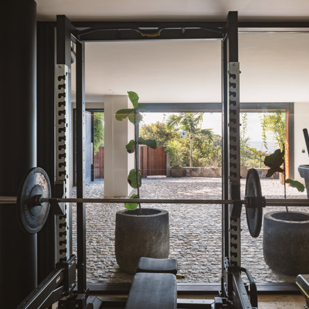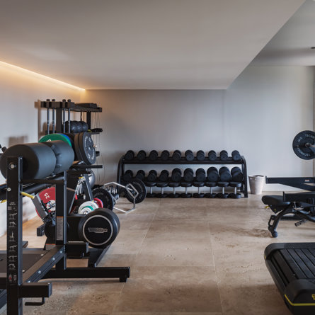 Air conditioning, Treadmill, Indoor bike, Weight bench, Weights.