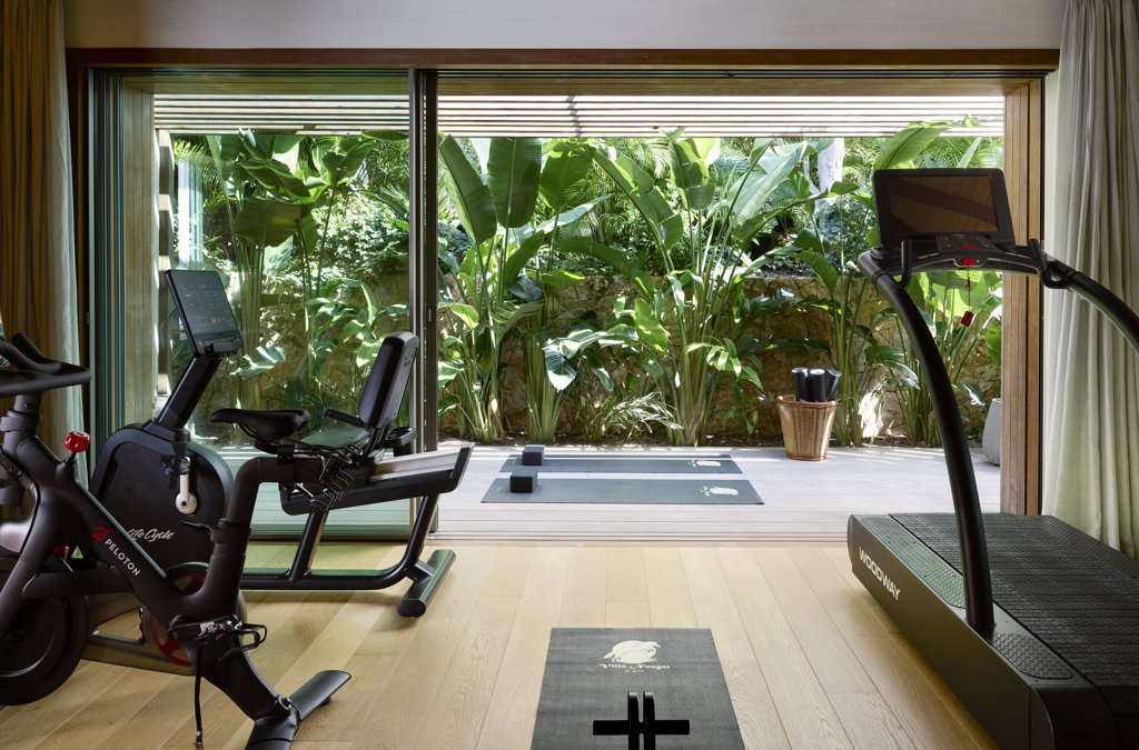 Air conditioning, Fan, Shower, Sink, Smart TV, Elliptical bike, Multi-Machine, Indoor bike, Weight bench, Weights, Toilet.