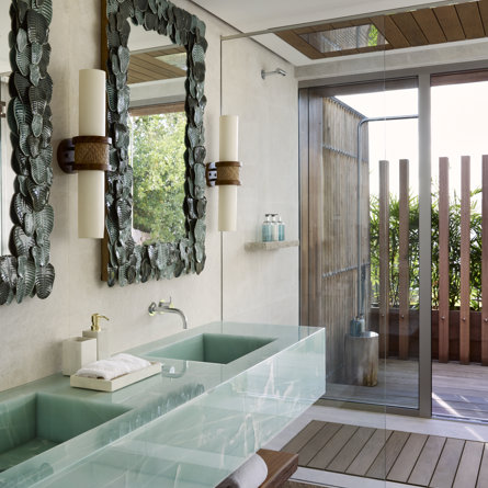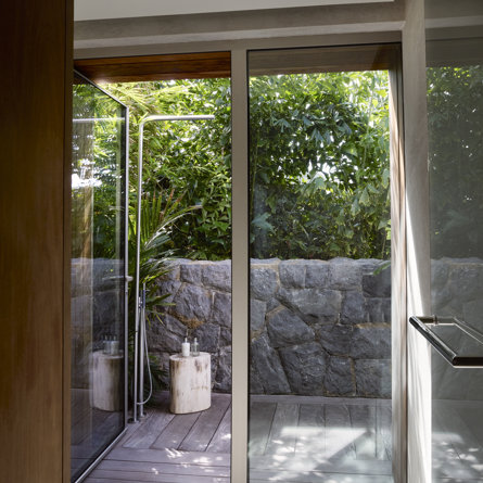 Ensuite bathroom, Walk-in shower, Outside shower, Two sinks, Hair dryer, Close toilet.