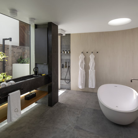 Ensuite bathroom, Walk-in shower, Bathtub, Outside shower, Two sinks, Hair dryer, Close toilet.