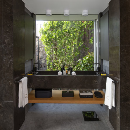 Ensuite bathroom, Walk-in shower, Outside shower, Two sinks, Hair dryer, Close toilet.