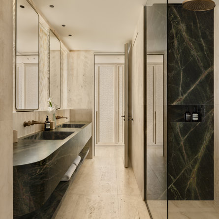 Ensuite bathroom, Walk-in shower, Bathtub, Outside shower, Hammam, Two sinks, Hair dryer, Close toilet.