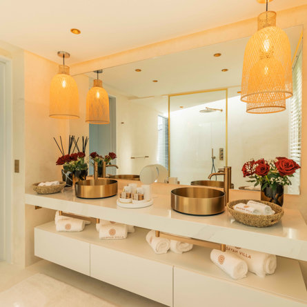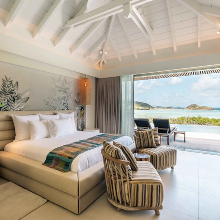 Perched on a hillside with sweeping views of the bay, Villa Quartz is an exquisite retreat for a peaceful island getaway. This three-bedroom villa offers a seamless blend of indoor-outdoor living with a spacious open-air kitchen, perfect for entertaining. After a session in the villa’s fitness room, the 16-meter heated swimming pool provides a serene place to refresh and relax and enjoy the breathtaking vistas and natural surrounds.