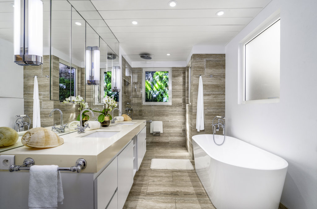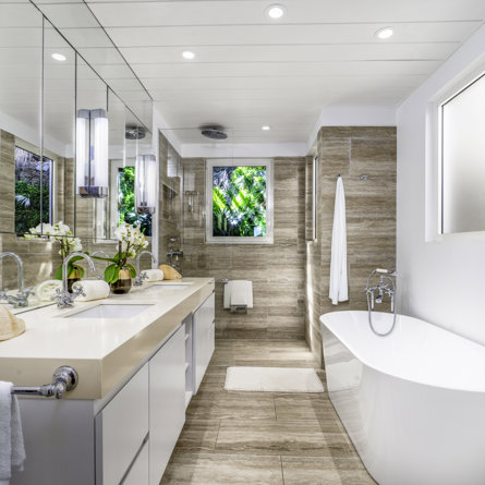 Ensuite bathroom, Walk-in shower, Bathtub, Two sinks, Hair dryer, Open toilet.