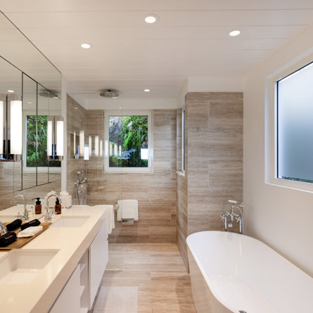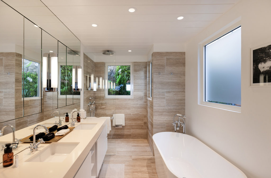 Ensuite bathroom, Walk-in shower, Bathtub, Two sinks, Hair dryer, Open toilet.