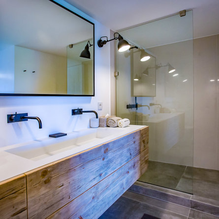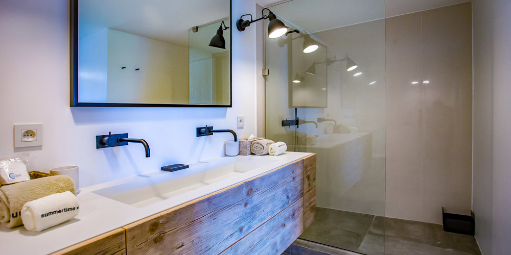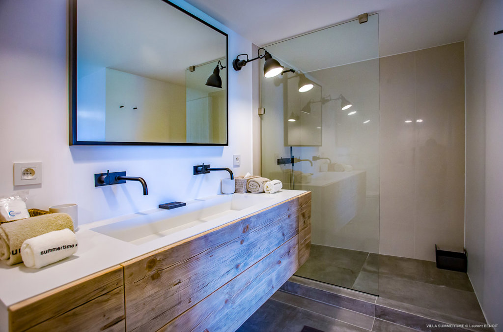 Ensuite bathroom, Walk-in shower, Two sinks, Hair dryer, Open toilet.