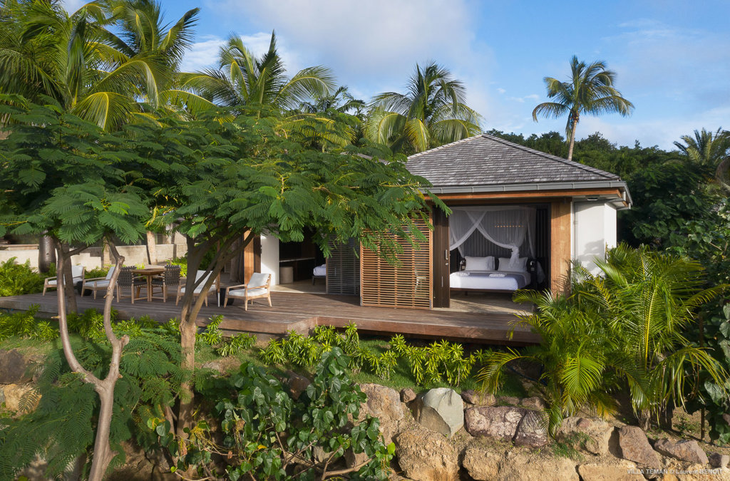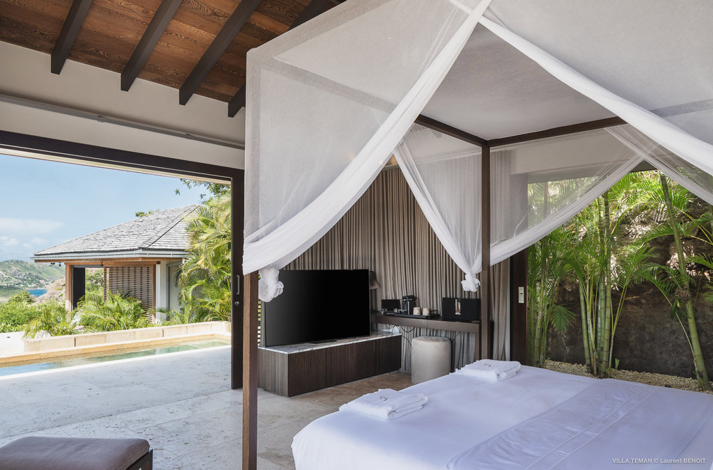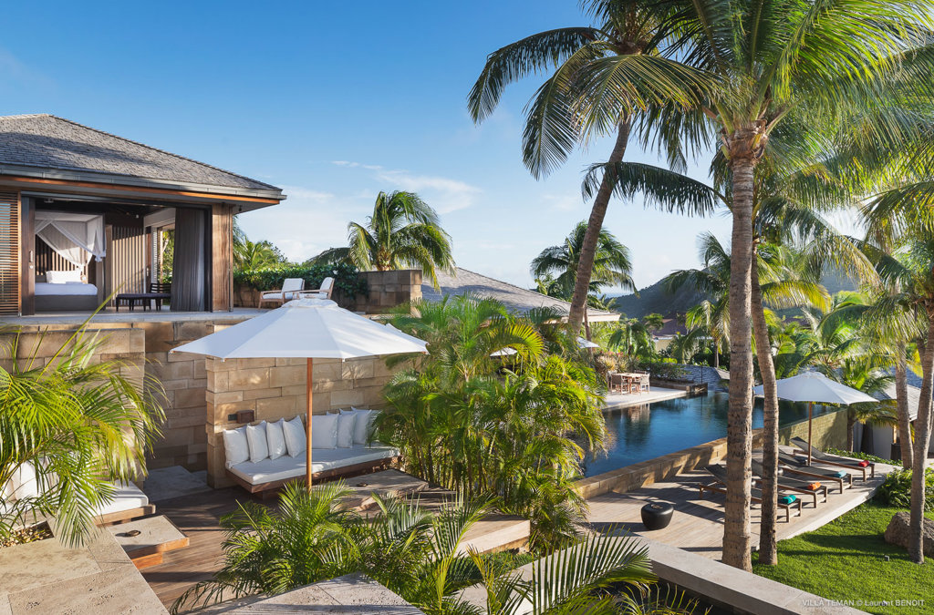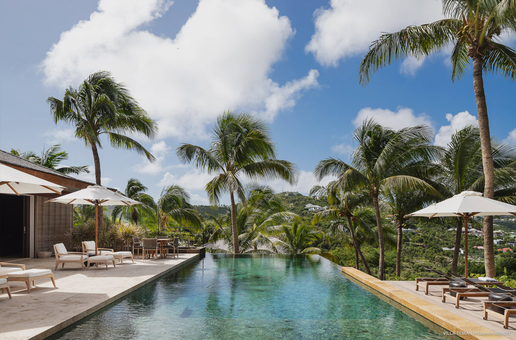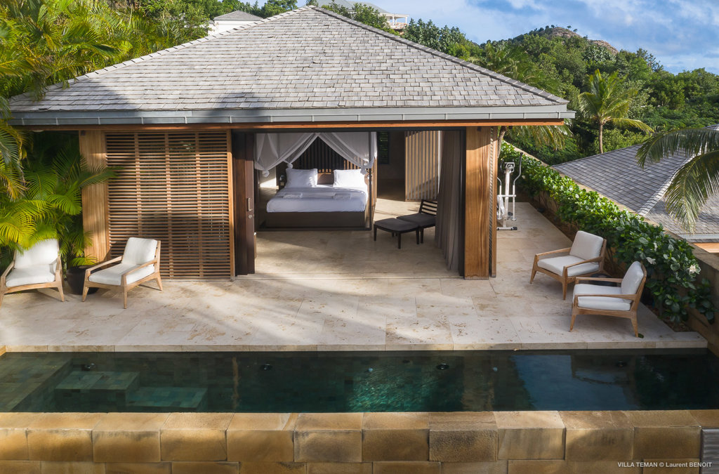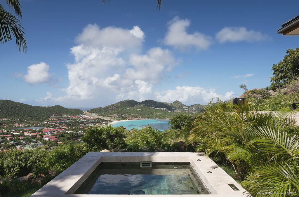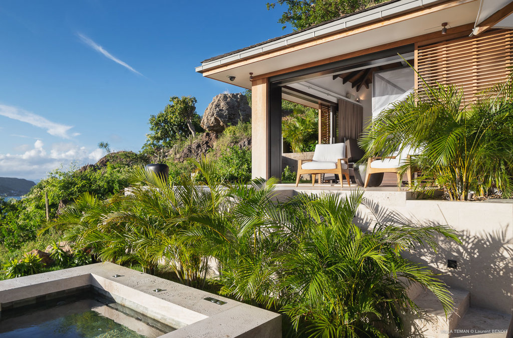 Gorgeous materials like travertine, Balinese stone and wood characterize the completely open yet very private Villa Teman, featuring five bedrooms over three levels, each with its own terrace, including two primary bedrooms — one with a private pool and the other with its own jacuzzi —situated in St Jean close to Eden Rock – St Barths with a view over the bay… the large spaces and tranquil garden create a soothing atmosphere for family and friends.