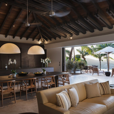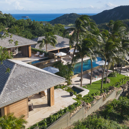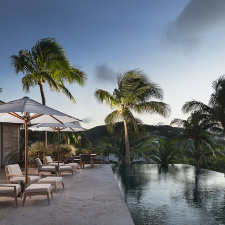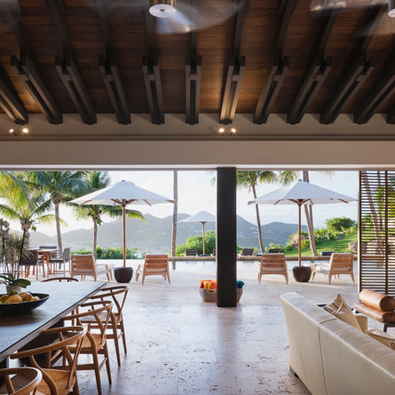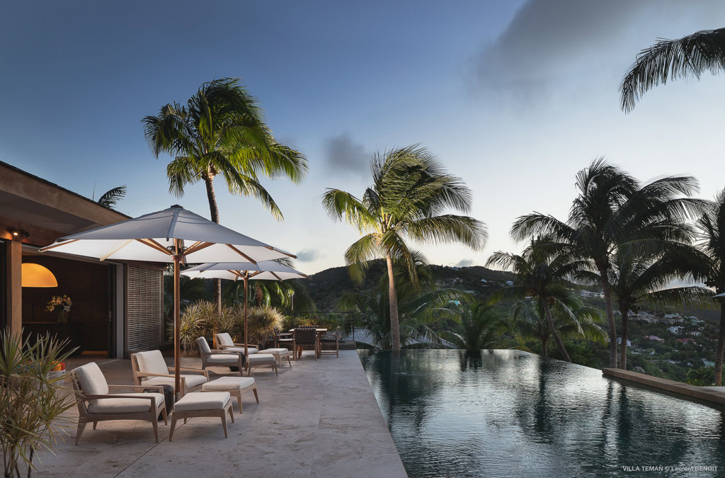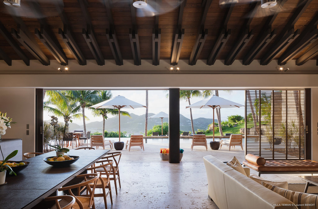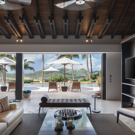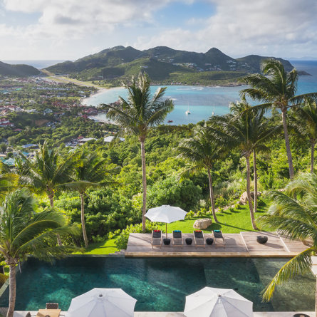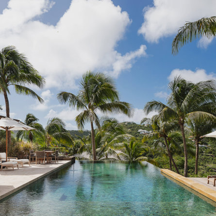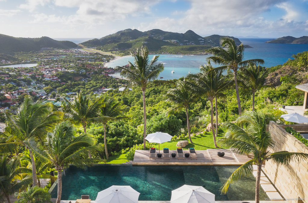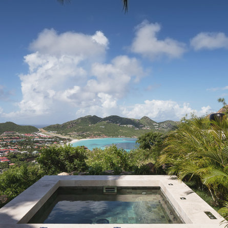 A large terrace and pool area give an immediate sensation of peace and harmony that is enhanced by a stunning panoramic view, the white sandy beach and turquoise waters of the St Jean Bay sparkle through the property s palm trees and contrast with a green lawn like colourful gemstones on a piece of jewellery.
