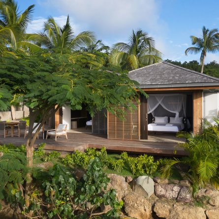 Full size guest suite in a jungle garden next to an overflow waterfall of the main pool. Inside and outside showers opening into private gardens. Terraces overlooking St Jean and the Eden Rock. A private pathway from the parking area to the guest suite.