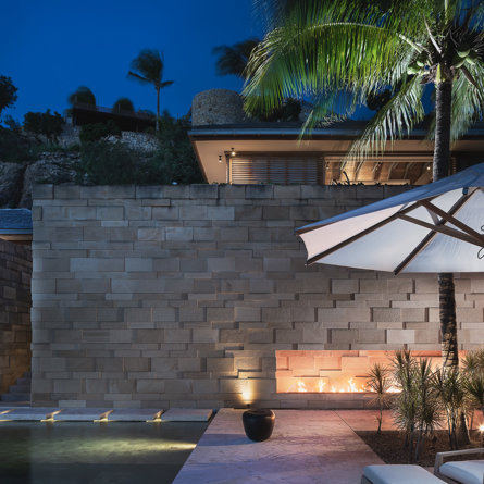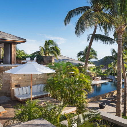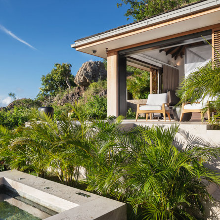Private terraces with views over the property, St Jean and the Eden Rock. An outdoor bathtub carved into an adjoining cliff. Walk up to your master suite over the main pool after passing a grand outdoor fireplace, the only existing one on the island.
