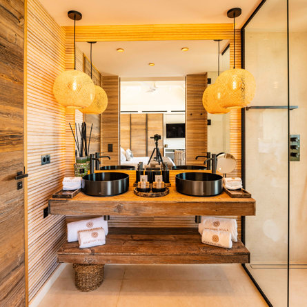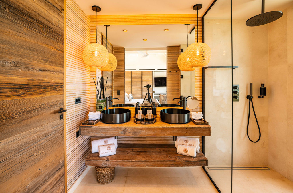Ensuite bathroom, Walk-in shower, two sinks, Hair dryer and Closed toilet.