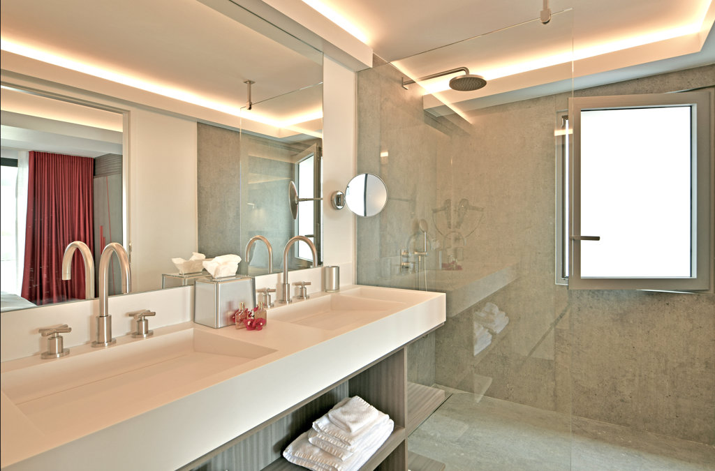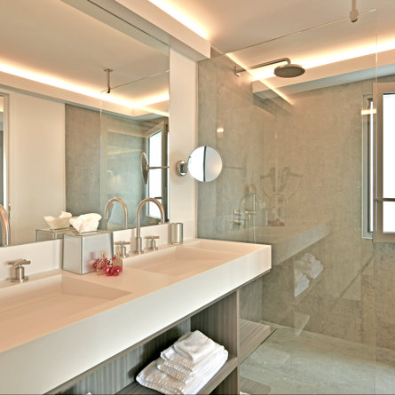 Ensuite bathroom, Walk-in shower, Two sinks, Hair dryer, Toilet.
