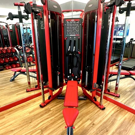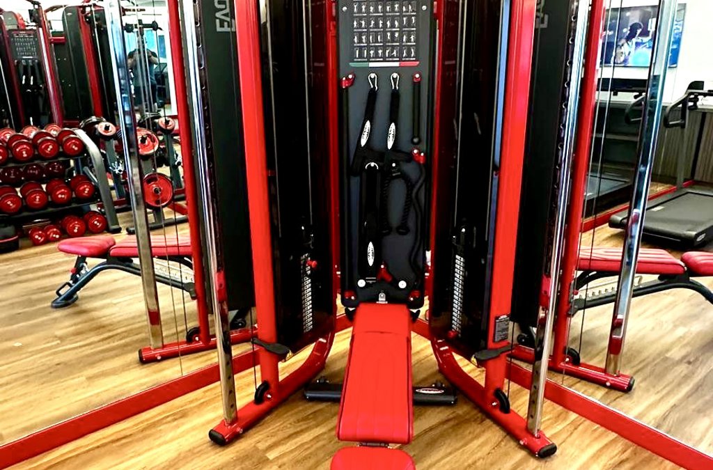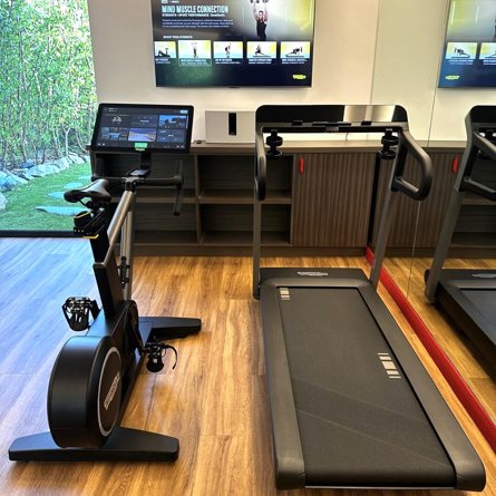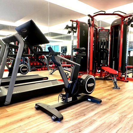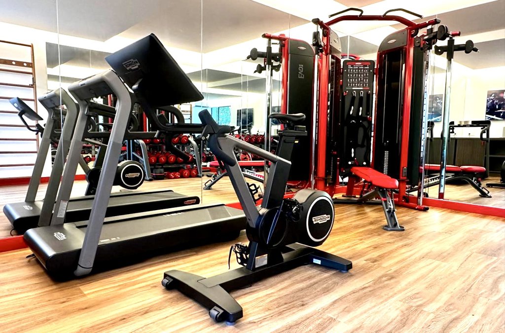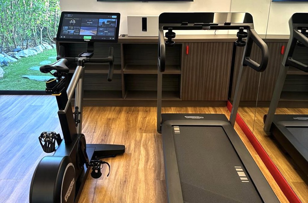 Air conditioning, Treadmill, Indoor bike, Weight bench, Weights.