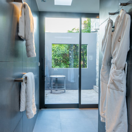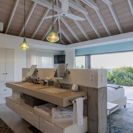 Ensuite bathroom, Walk-in shower, Outside shower, Two sinks, Hair dryer, Open toilet.
