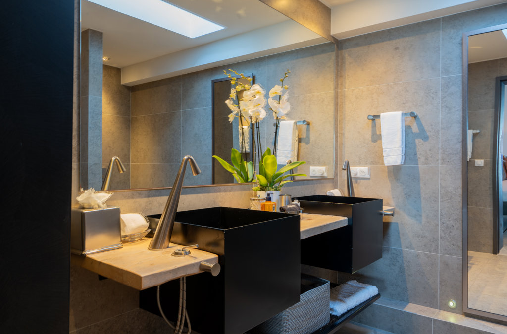 Ensuite bathroom, Walk-in shower, Two sinks, Hair dryer, Open toilet.