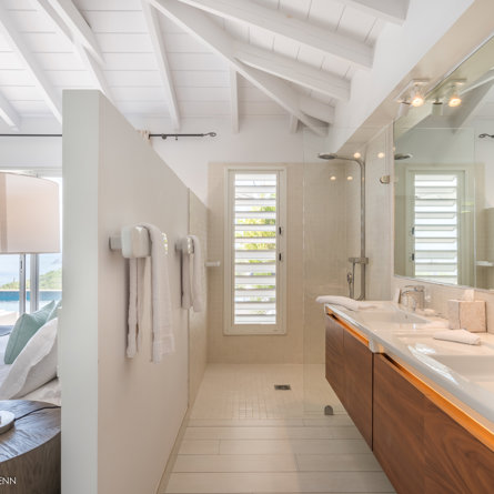 Ensuite bathroom, Outside shower, Two sinks, Hair dryer, Toilet.