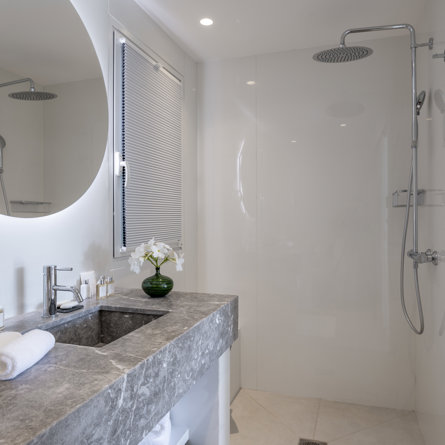 Ensuite bathroom, Walk-in shower, Sink, Hair-dryer, Toilet.