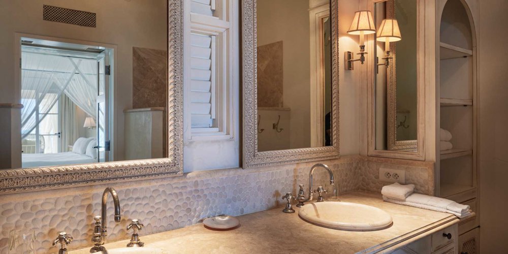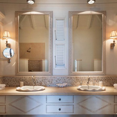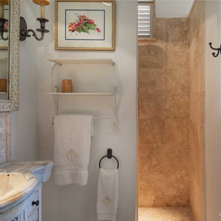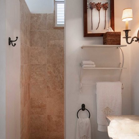 Ensuite bathroom, Walk-in shower, Outside shower, Two sinks, Hair dryer, Open toilet.