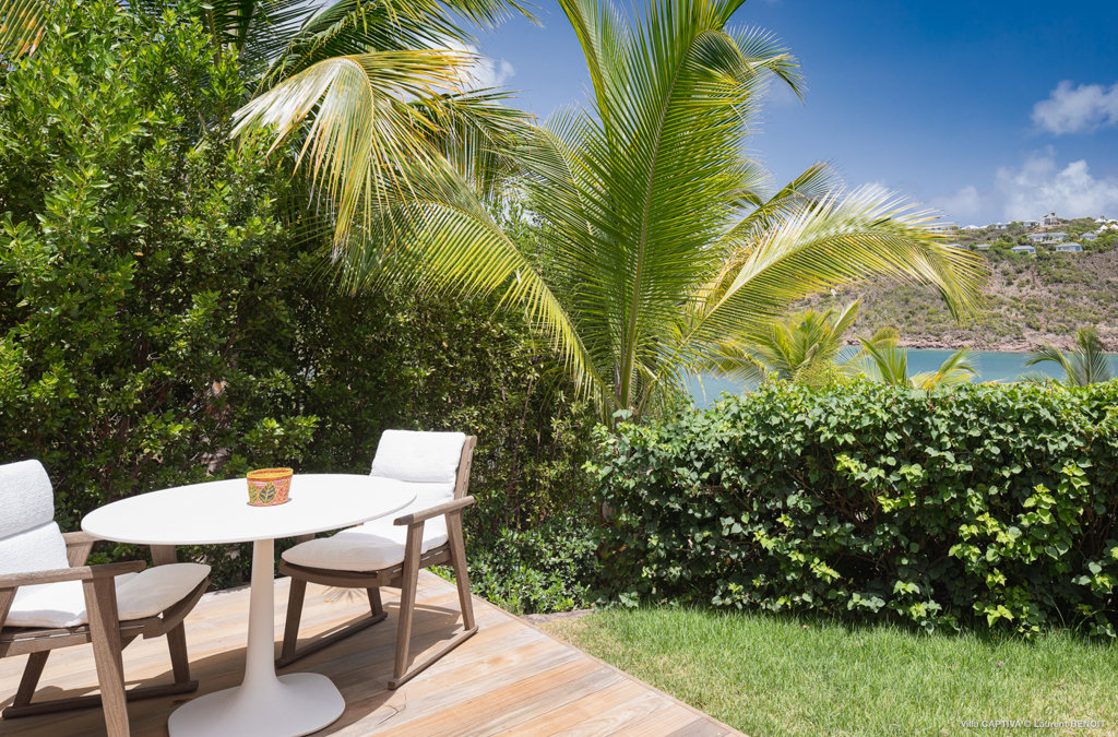 Sea & garden view, Private terrace, Air conditioning, Fan, Queen size bed, Walk-in closet, TV, Apple TV, Satellite, Safe. Ensuite bathroom, Walk-in shower, Two sinks, Hair dryer, Toilet.