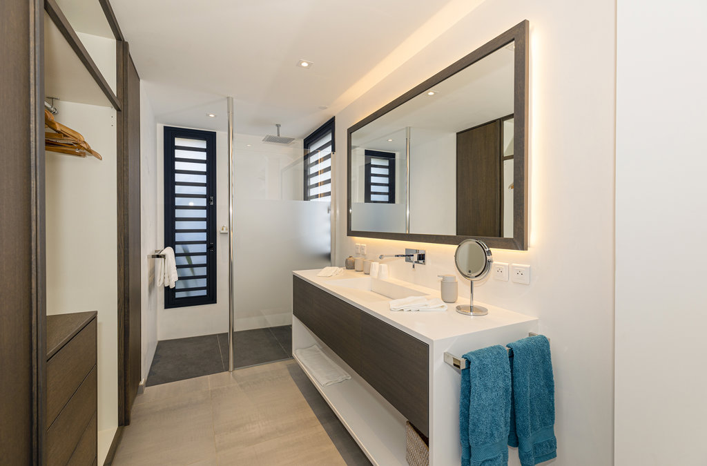 Ensuite bathroom, Walk-in shower, Sink, Hair dryer, Toilet.
