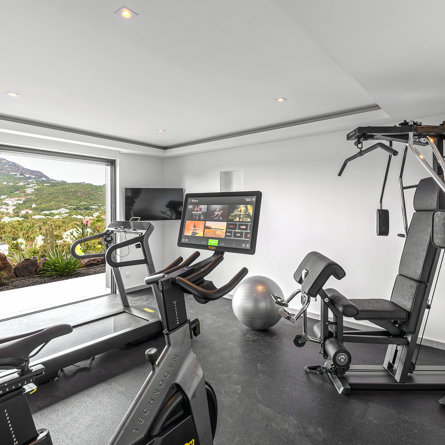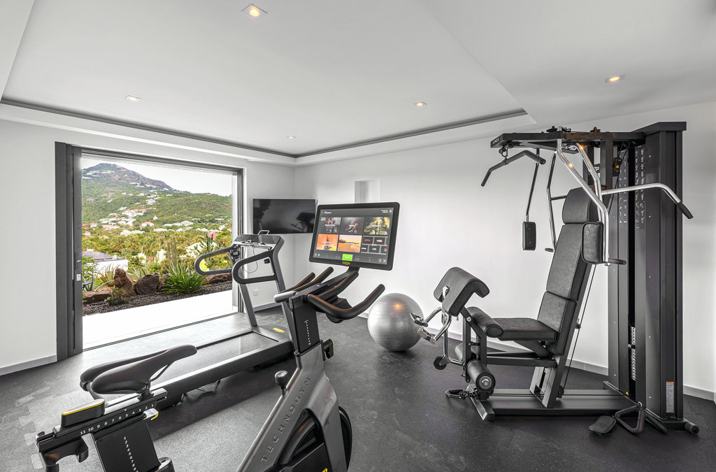 Air conditioning, Treadmill, Indoor bike, Weight bench, Yoga mats.