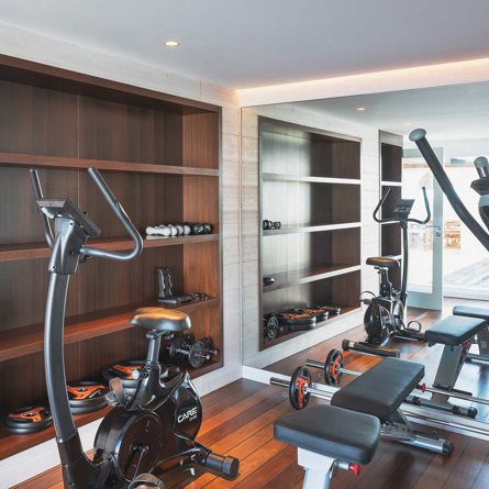 Air conditioning, TV, Treadmill, Elliptical bike, Indoor bike and Weights.