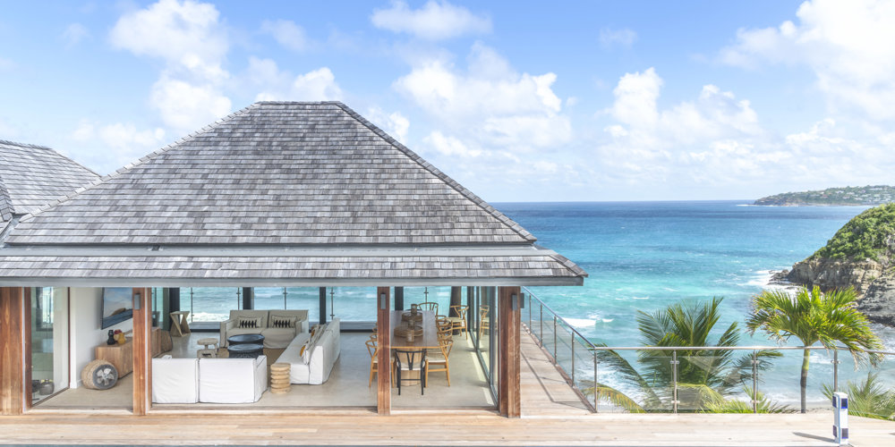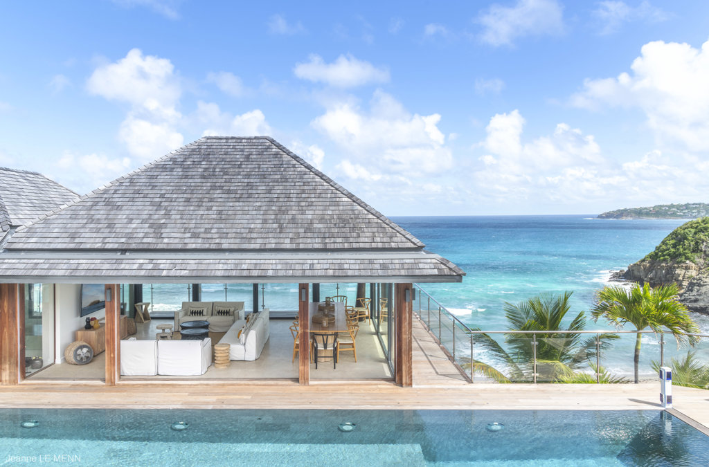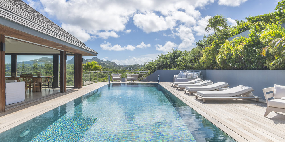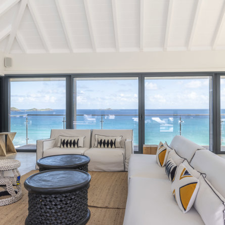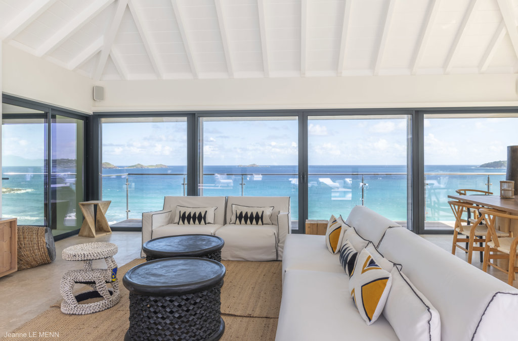 Floor-to-ceiling glass windows create a bright, open, and welcoming atmosphere perfect for a family getaway at Villa Firefly in Anse des Cayes, featuring six air-conditioned bedrooms with modern décor under the same roof, a separated primary bedroom and a pool that is protected from the sea breeze for relaxed lounging