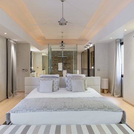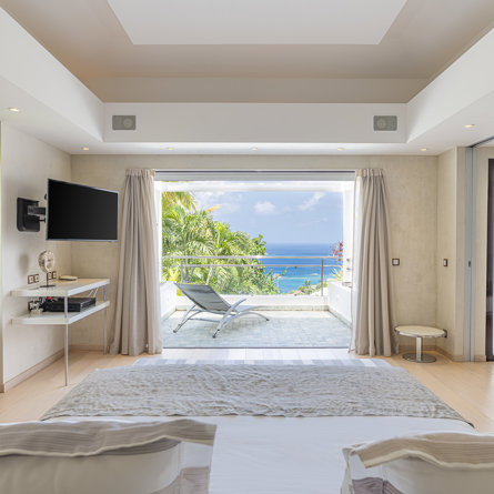Sea & pool view, Terrace, Air conditioning, Fan, King size bed, Wardrobe, TV, Dish, Black out curtains.