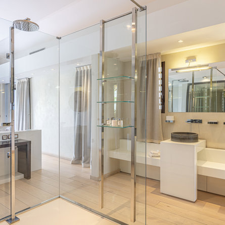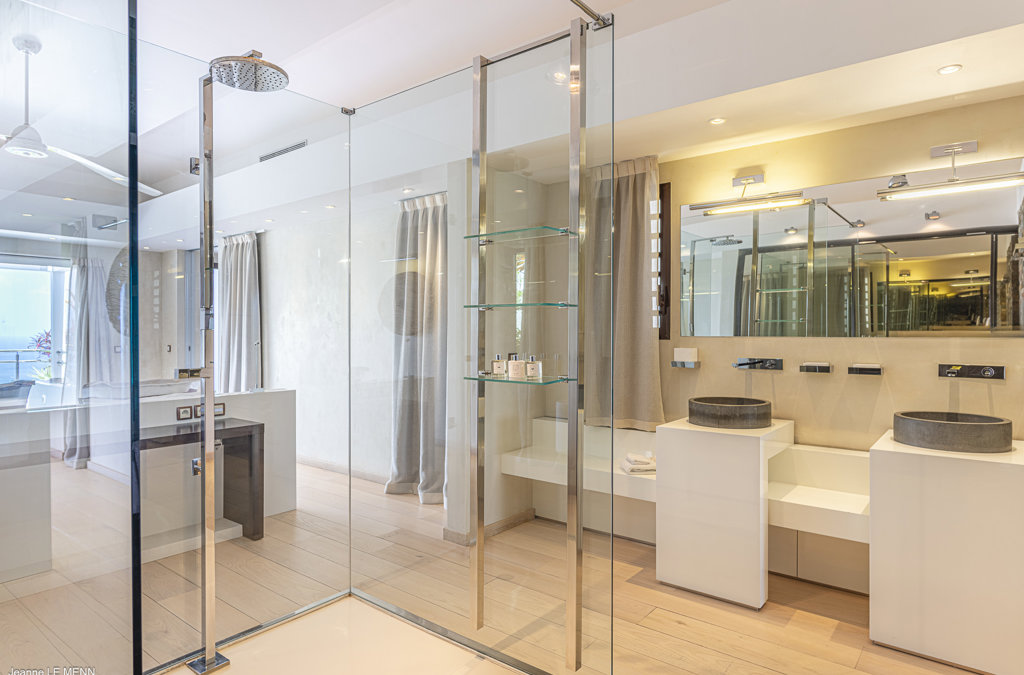 Open bathroom, Walk-in shower, Two sinks, Hair dryer, Closed toilet.