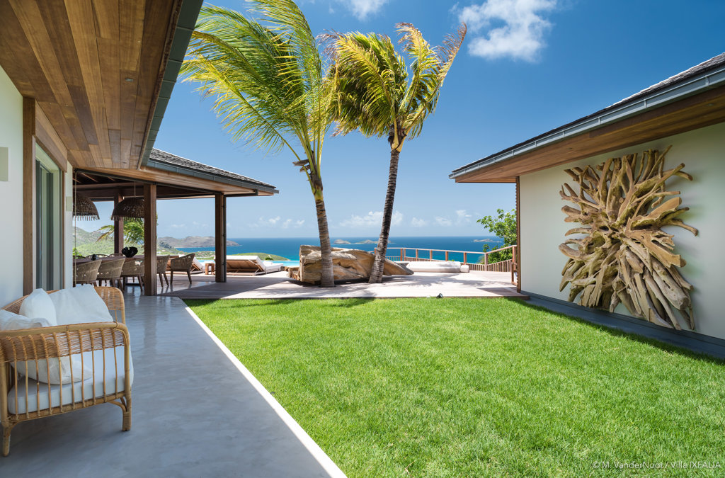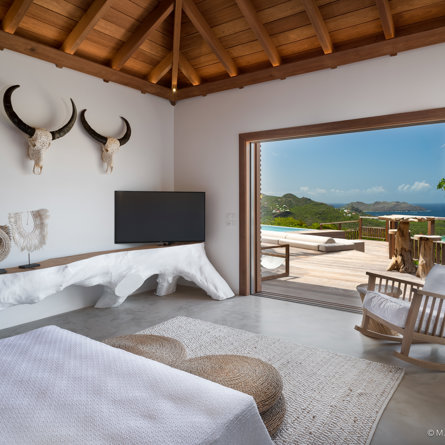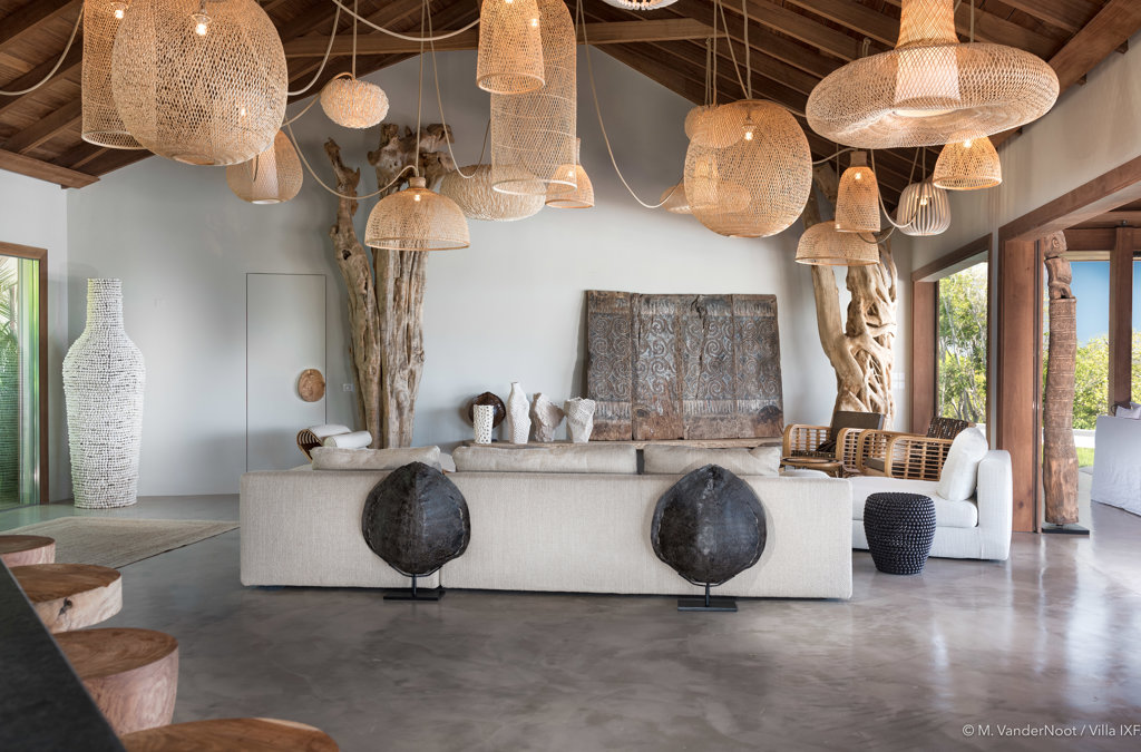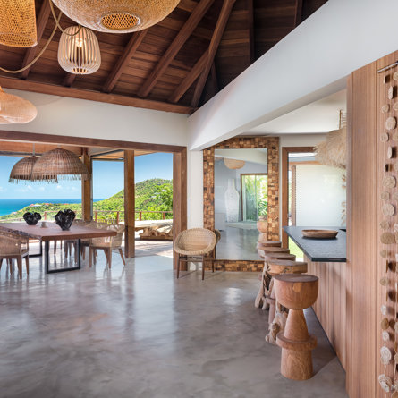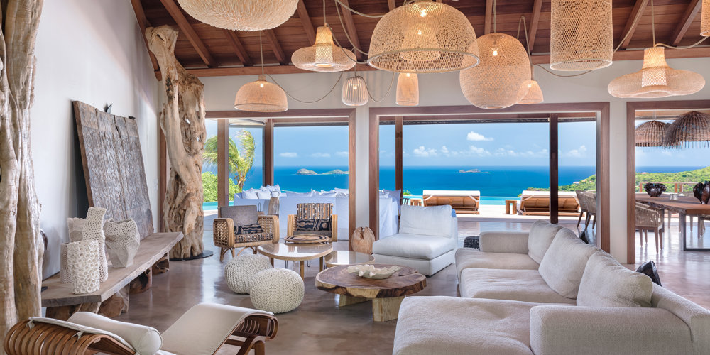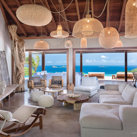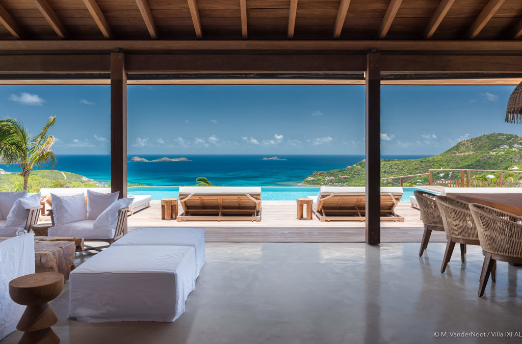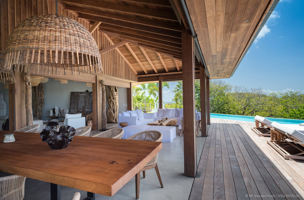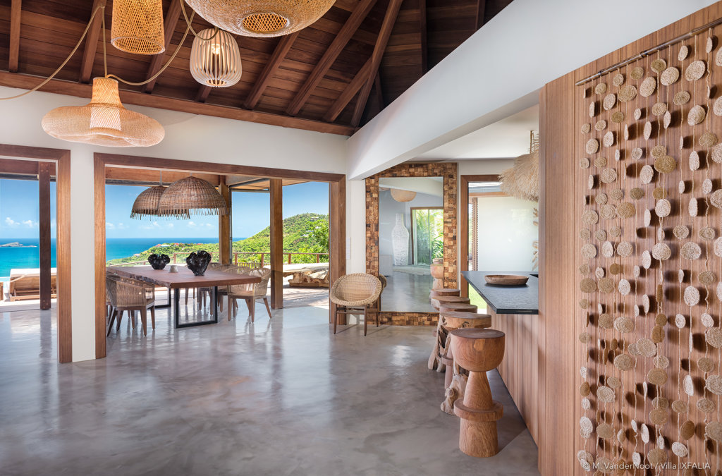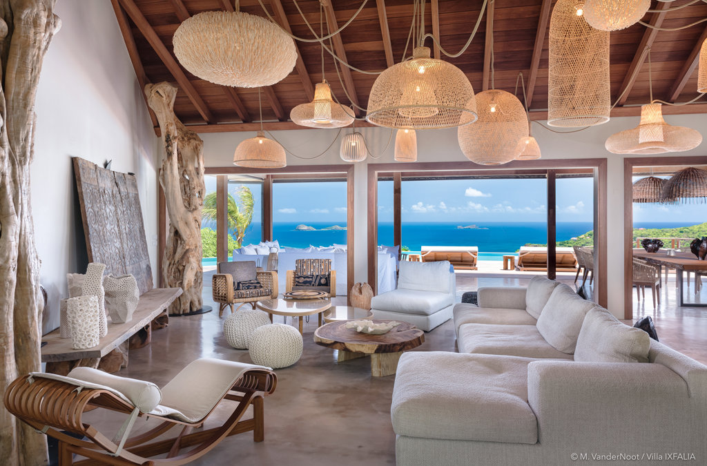 The wide-open African lodge-style Villa Ixfalia is full of personality thanks to its rattan décor and boho-chic vibe, located at the top of St Jean for full privacy and isolation overlooking beautiful Eden Rock – St Barths, with bedrooms with large bathrooms to please even the teenagers in the family.