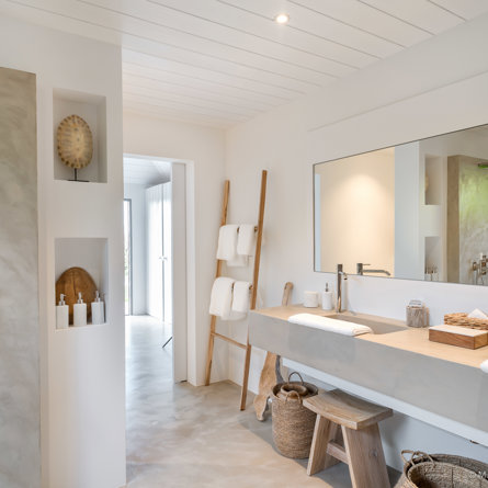 Ensuite bathroom, Walk-in shower, Outside shower, Two sinks, Hair dryer, Toilet.
