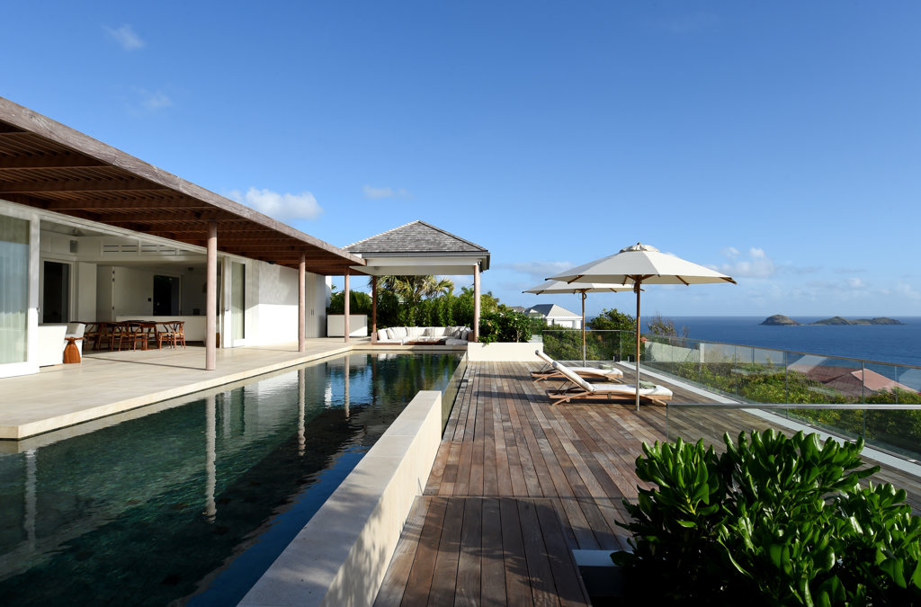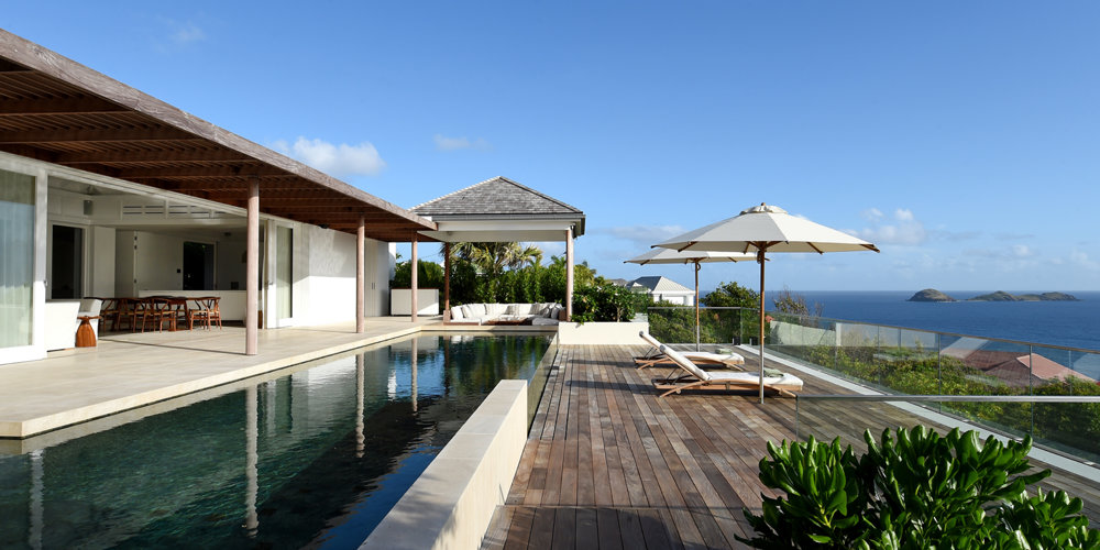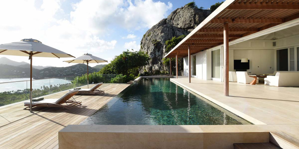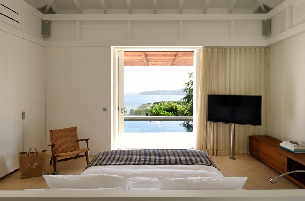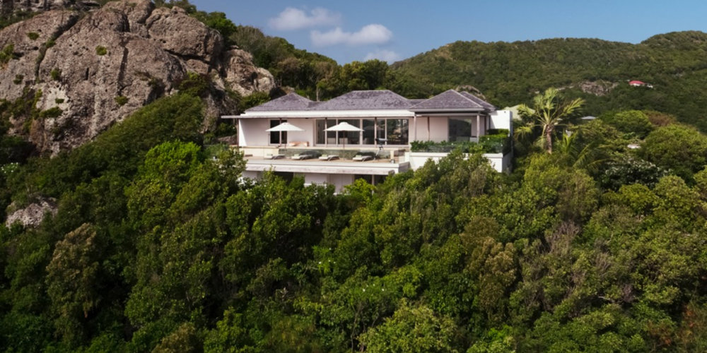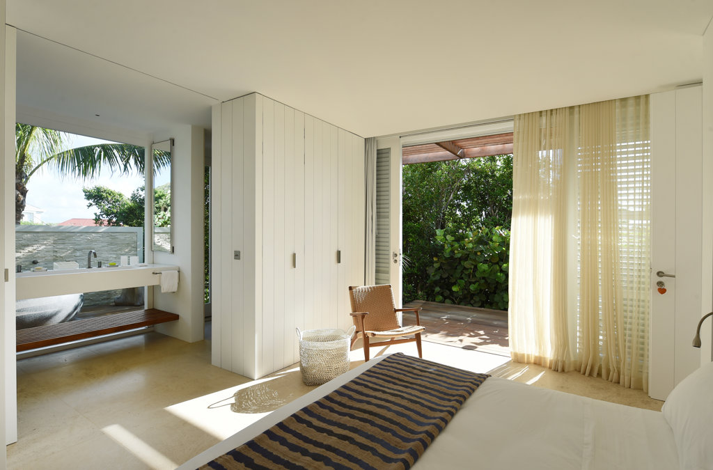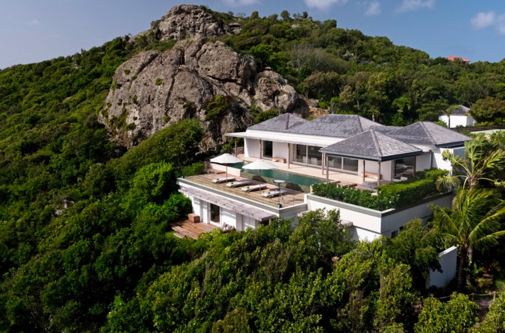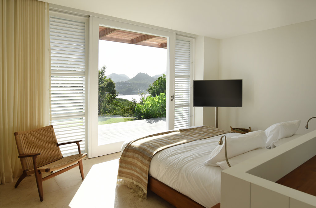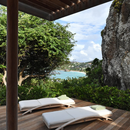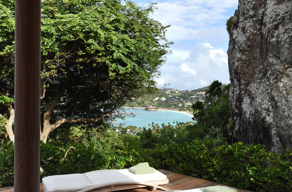 Nestled into the rocks above Anse des Cayes, the views outside Villa La Galtayrie are as stunning as the house itself, which offers soothing minimalist décor throughout its one upstairs and two downstairs bedrooms, plus a kid’s bedroom — all with air-conditioning —and a bright, generously-sized deck.