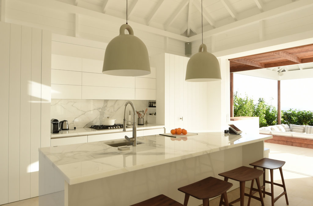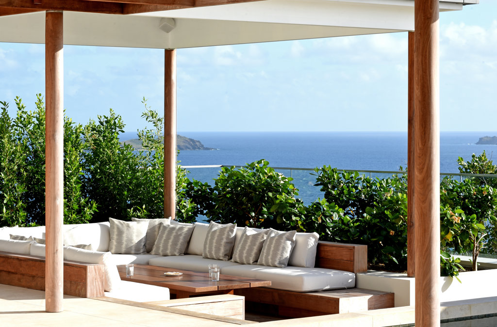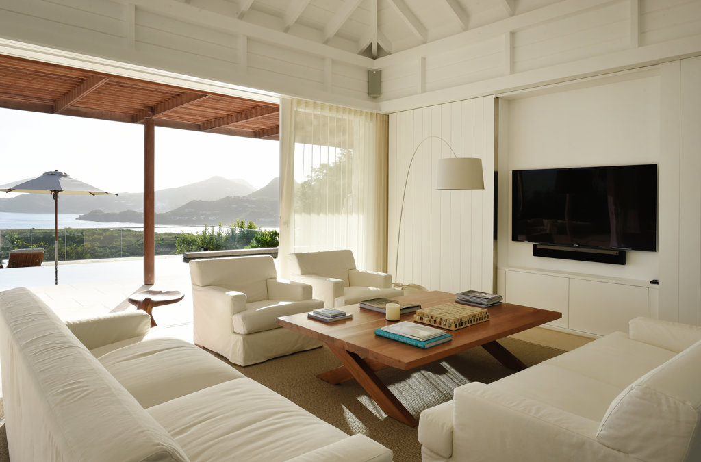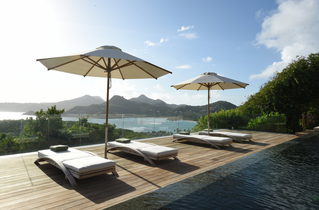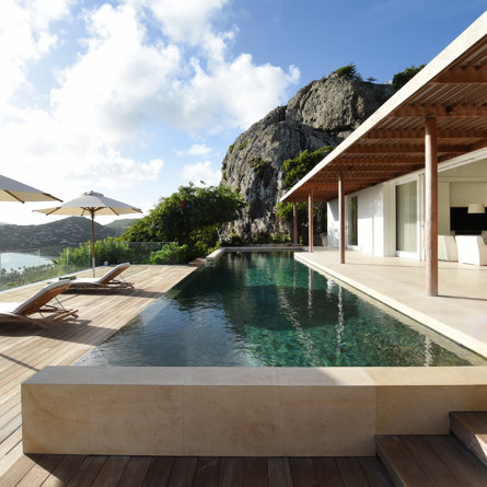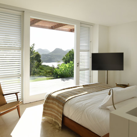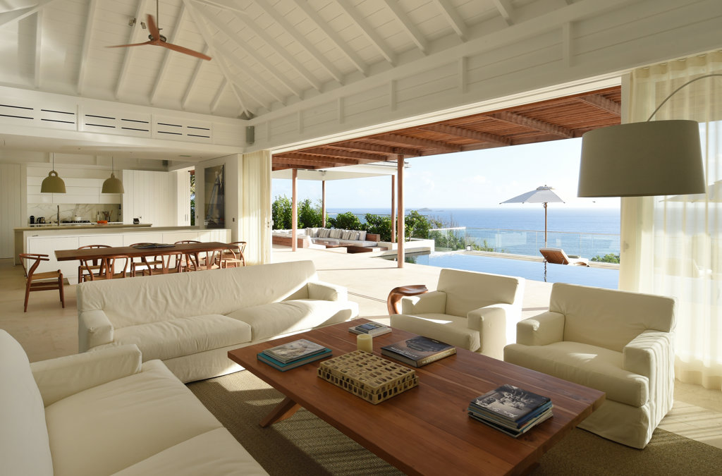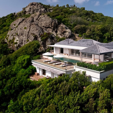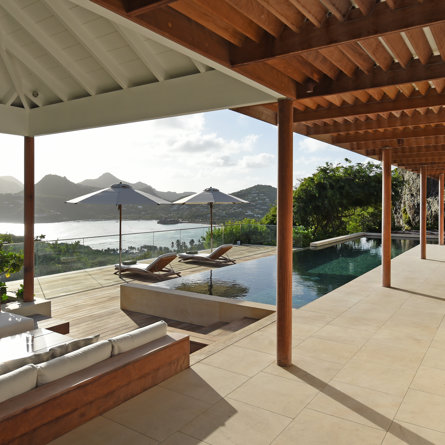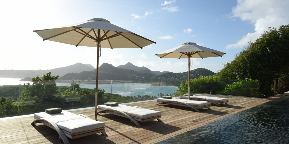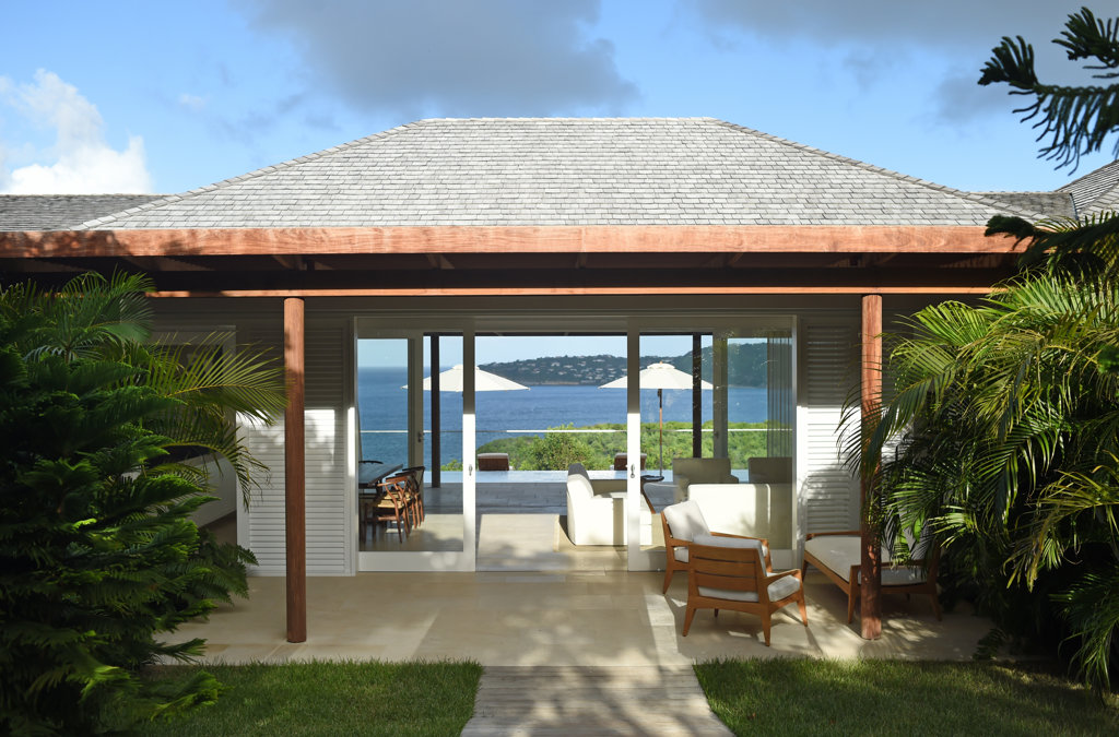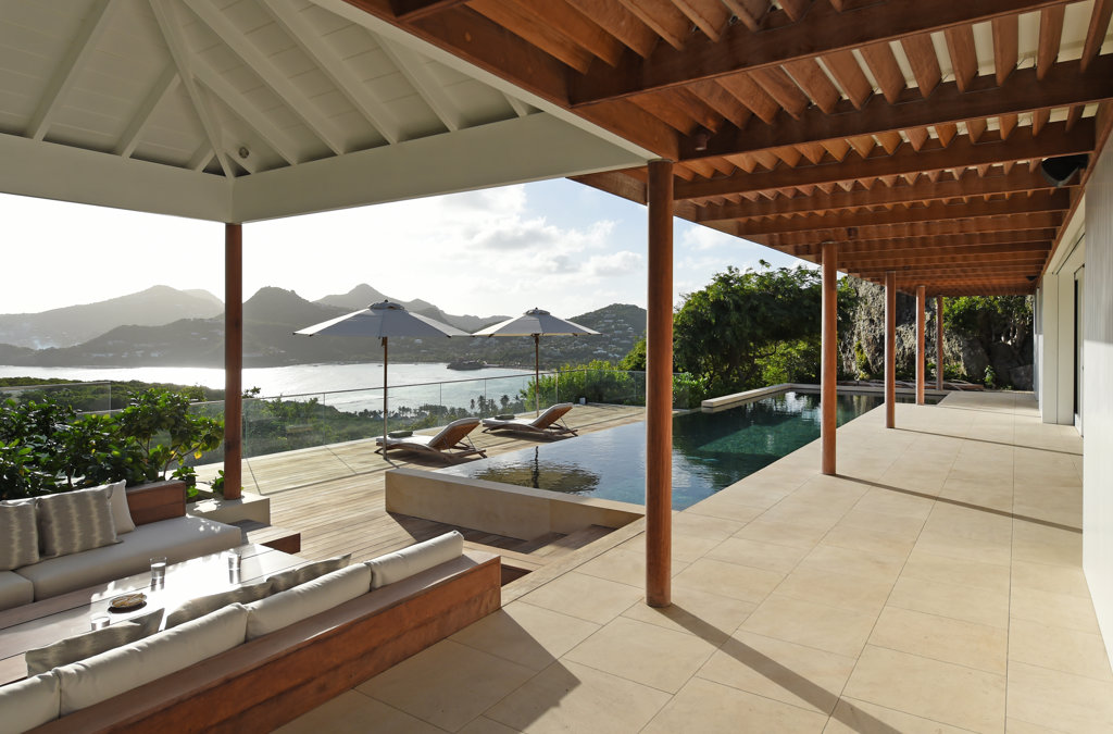Nestled into the rocks above Anse des Cayes, the views outside Villa La Galtayrie are as stunning as the house itself, which offers soothing minimalist décor throughout its one upstairs and two downstairs bedrooms, plus a kid’s bedroom — all with air-conditioning —and a bright, generously-sized deck.