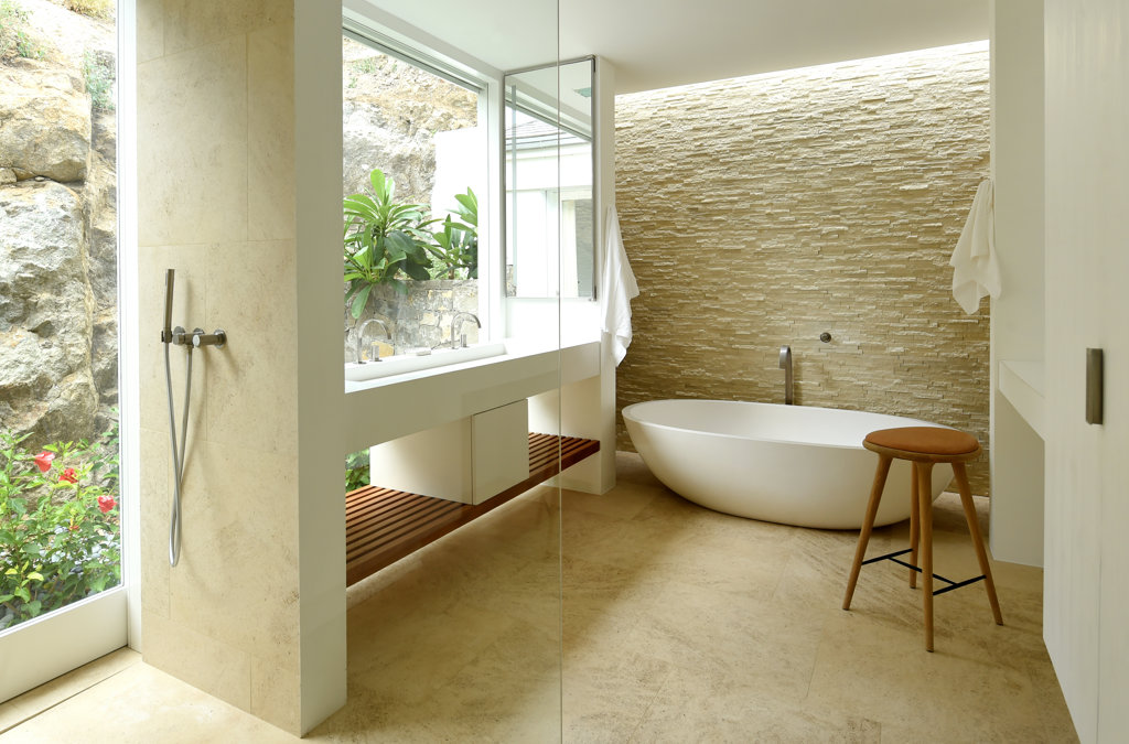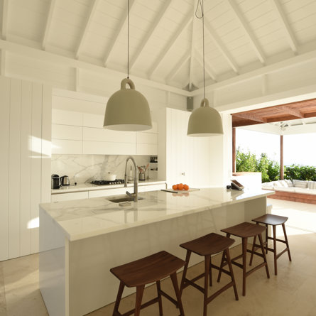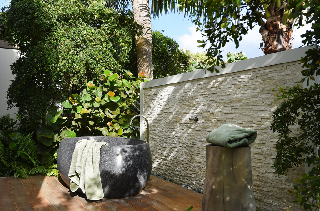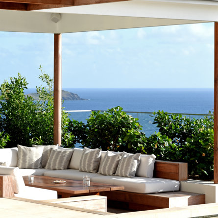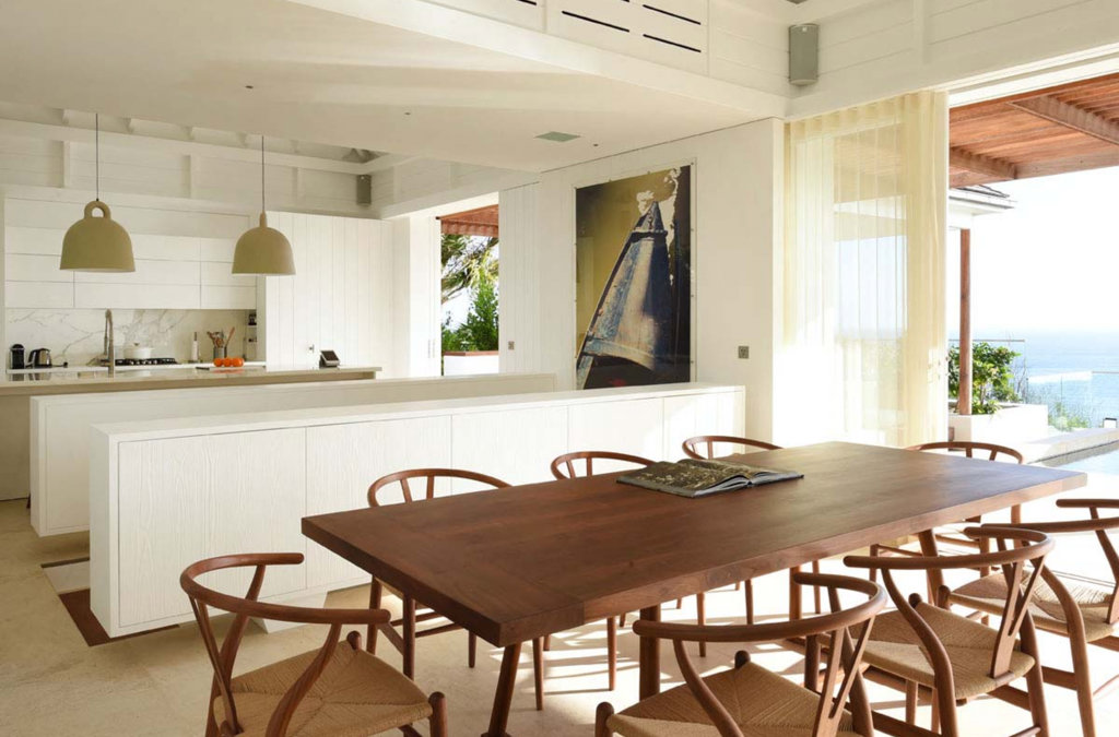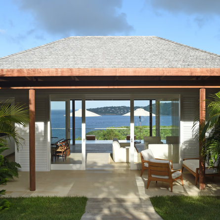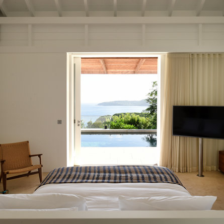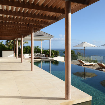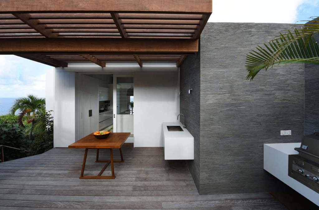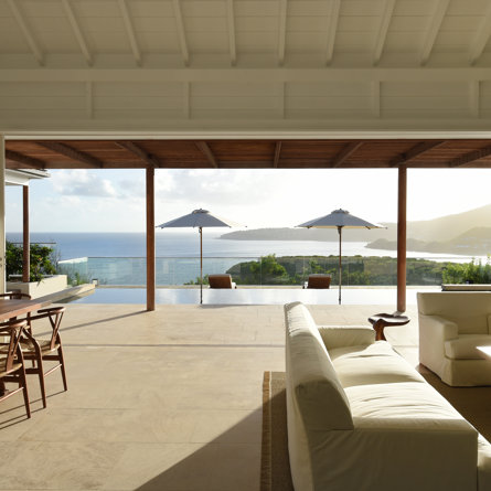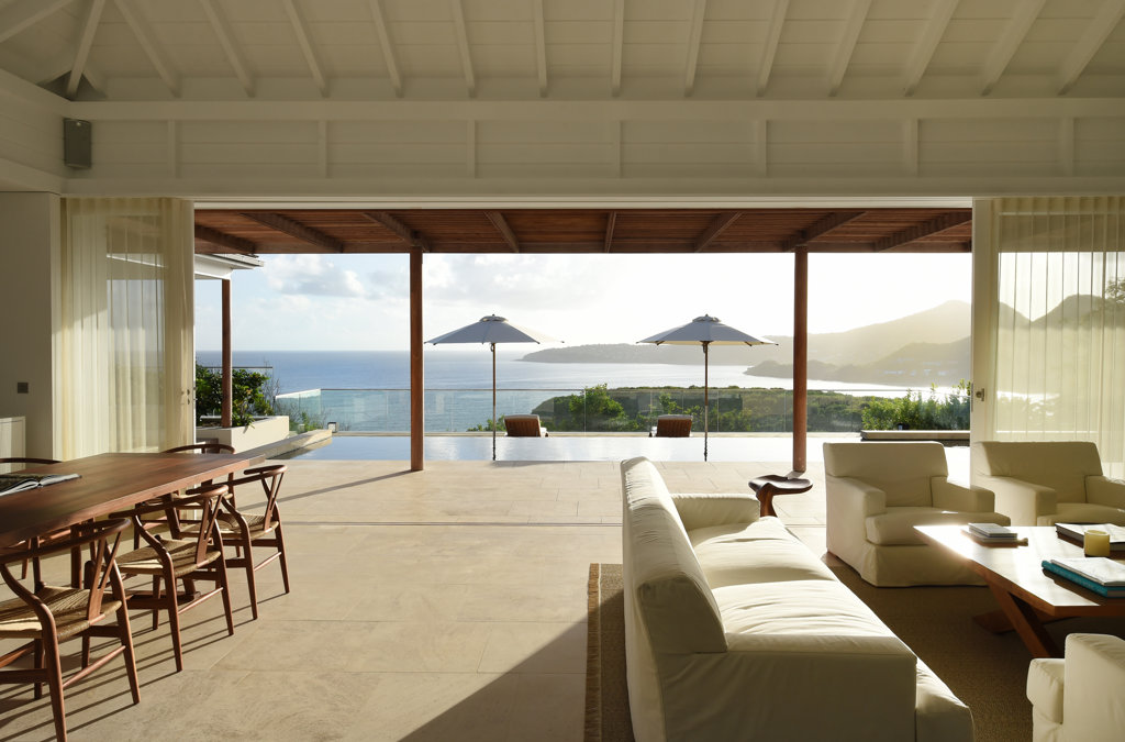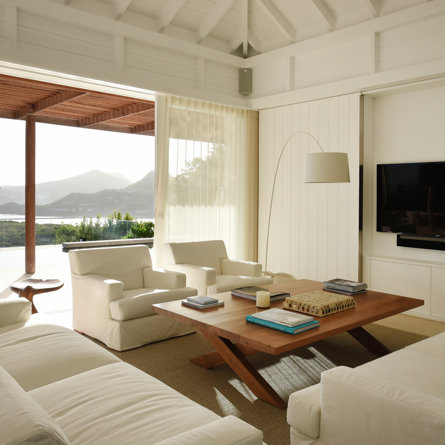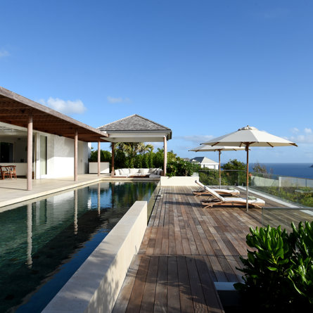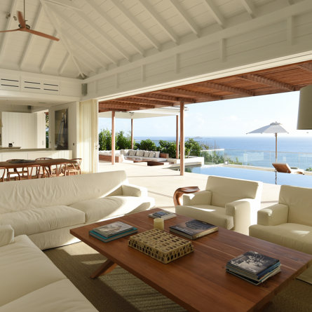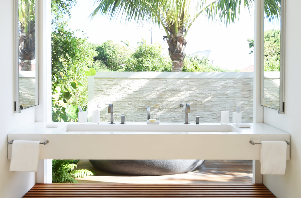 Nestled into the rocks above Anse des Cayes, the views outside Villa La Galtayrie are as stunning as the house itself, which offers soothing minimalist décor throughout its one upstairs and two downstairs bedrooms, plus a kid’s bedroom — all with air-conditioning —and a bright, generously-sized deck.