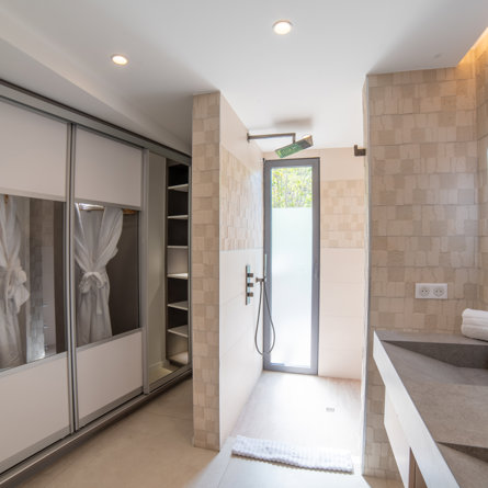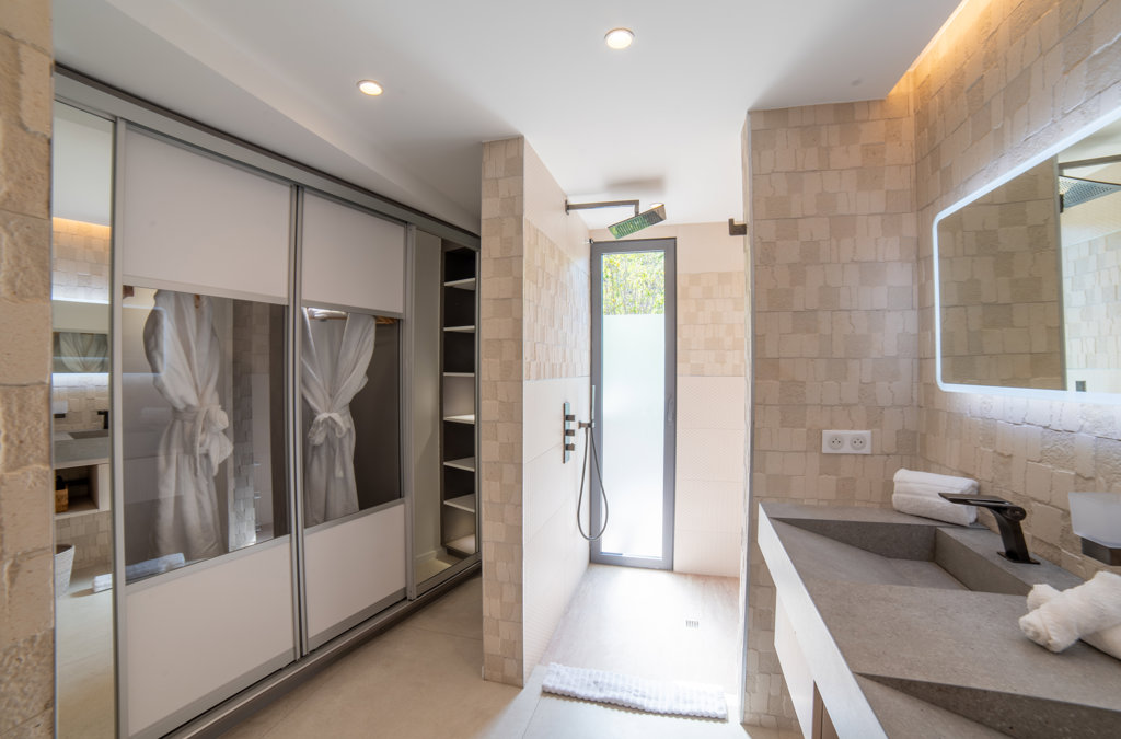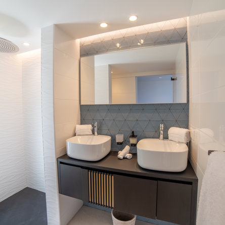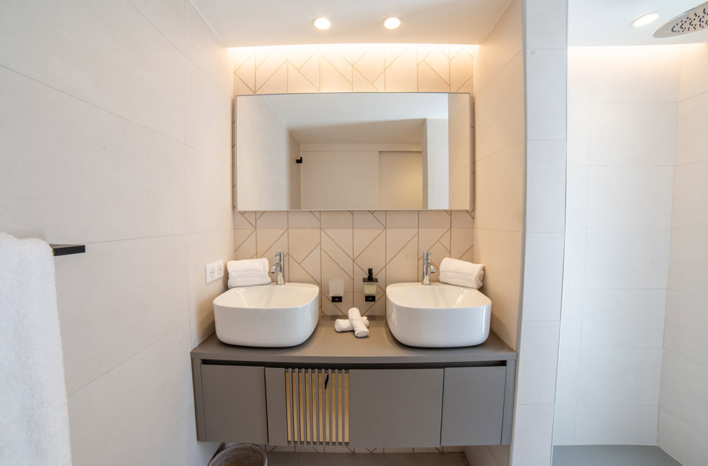Ensuite bathroom, Walk-in shower, Two sinks, Toilet.