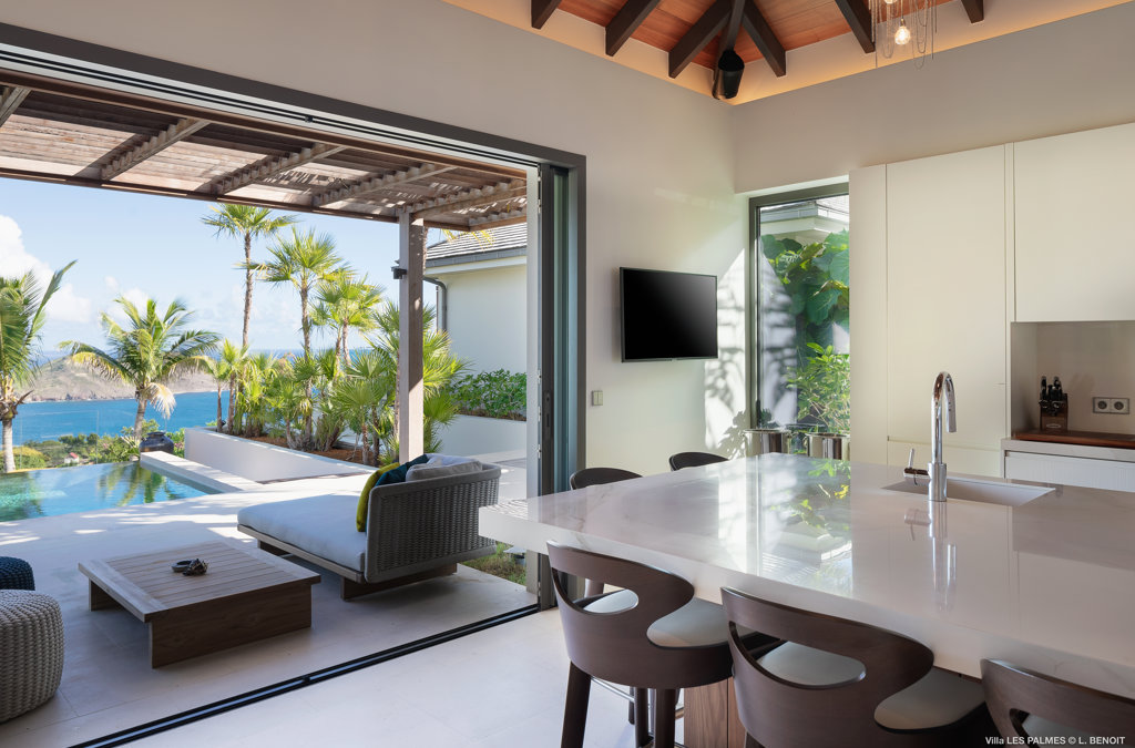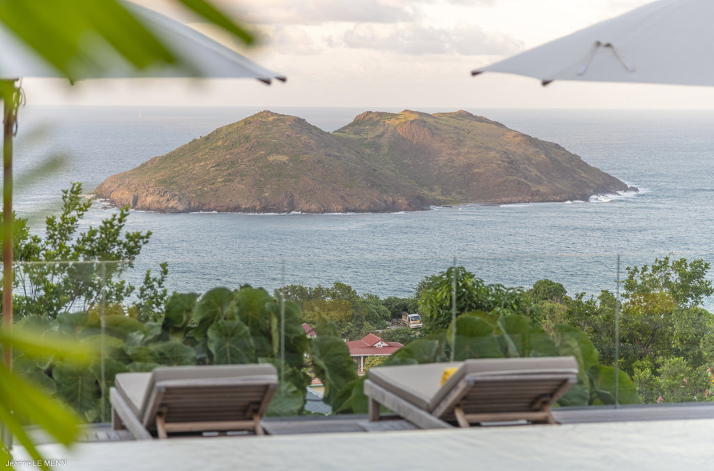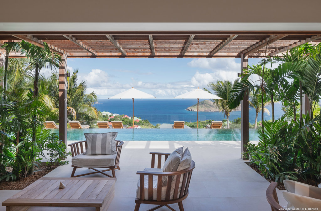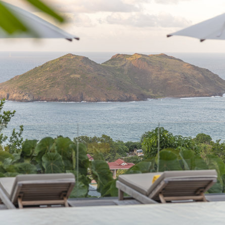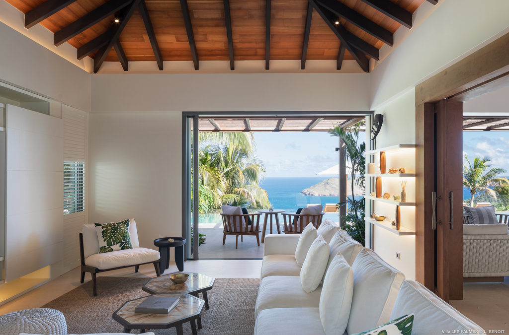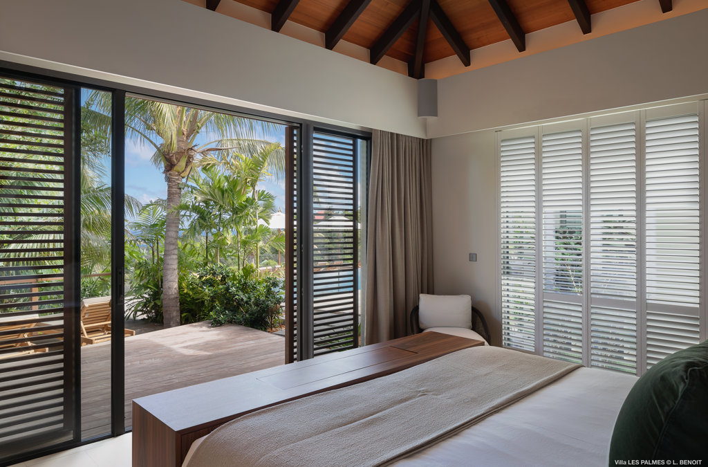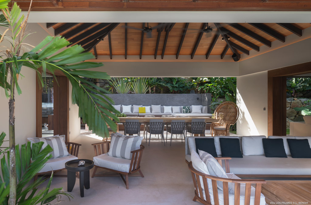 Gaze upon the picturesque village of Colombier and Flamands Bay from your perch at Villa Les Palmes, sister home Villa Les Roches just above, featuring large outdoor and indoor areas including a small garden, five bedrooms and a modern aesthetic with air conditioning throughout — great for friends and family to enjoy the St Barths life in Colombier.