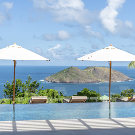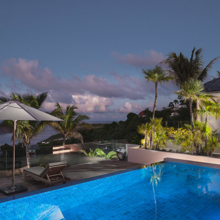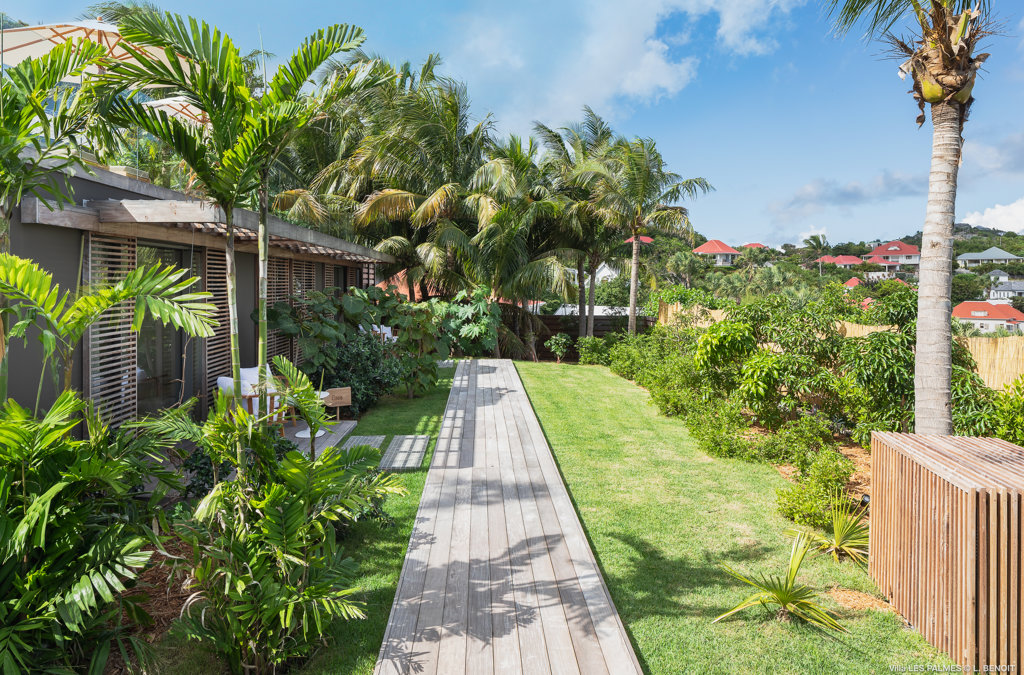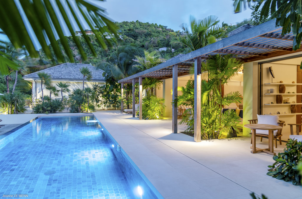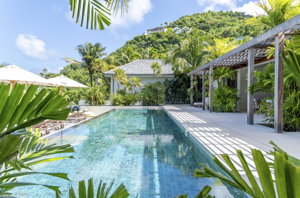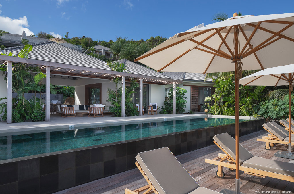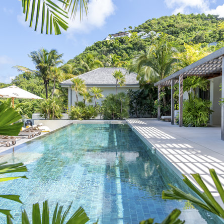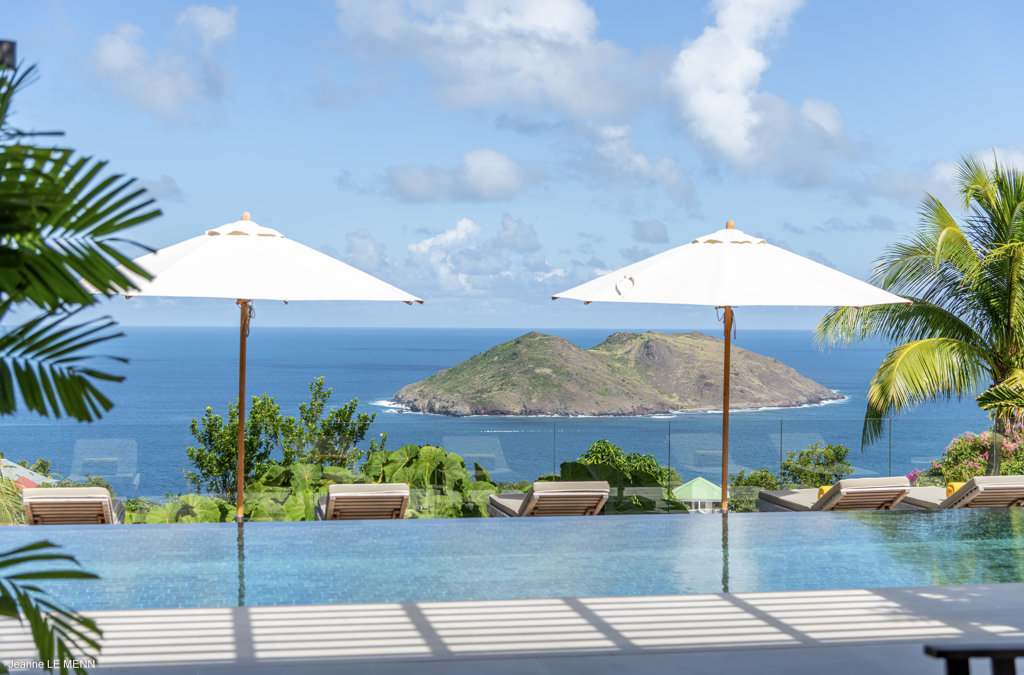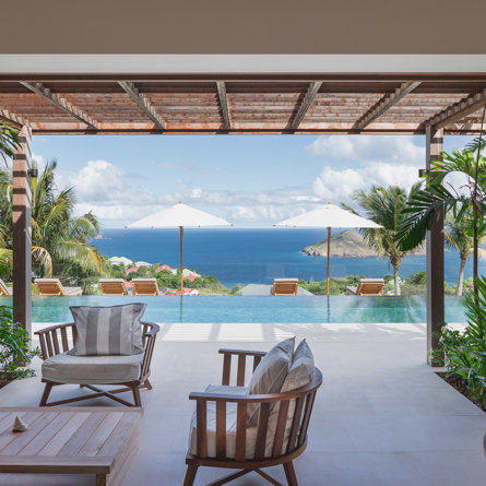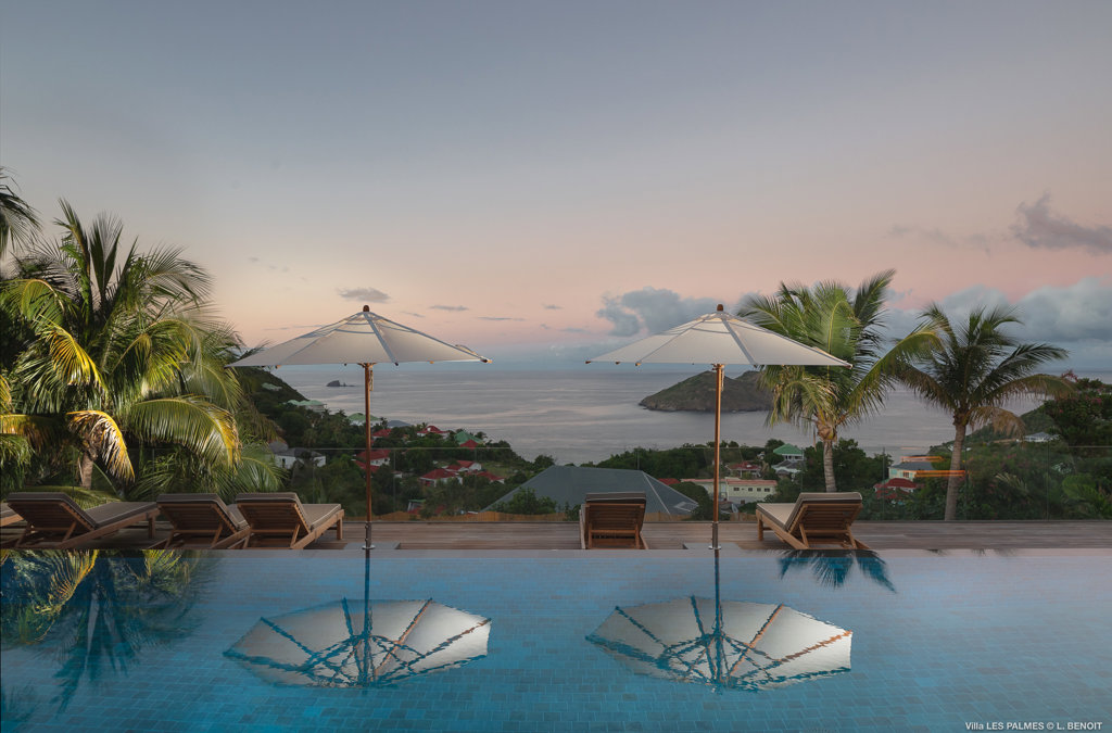 Gaze upon the picturesque village of Colombier and Flamands Bay from your perch at Villa Les Palmes, sister home Villa Les Roches just above, featuring large outdoor and indoor areas including a small garden, five bedrooms and a modern aesthetic with air conditioning throughout — great for friends and family to enjoy the St Barths life in Colombier.