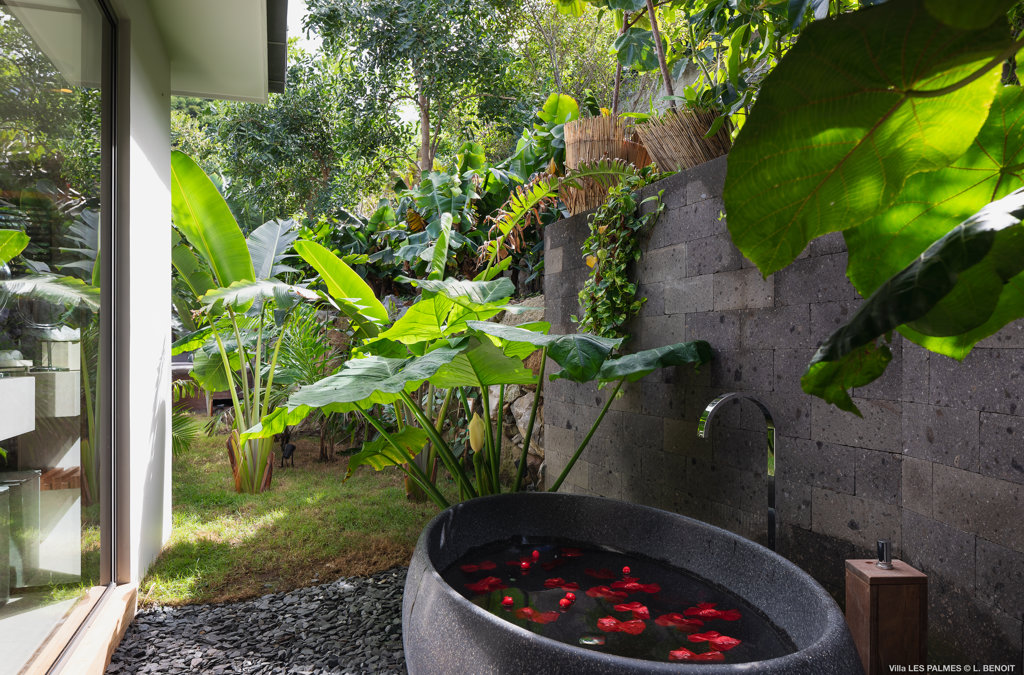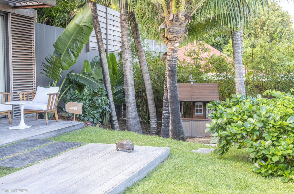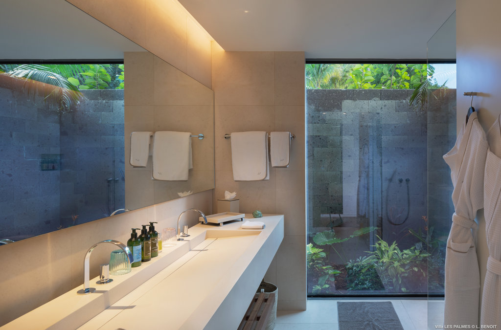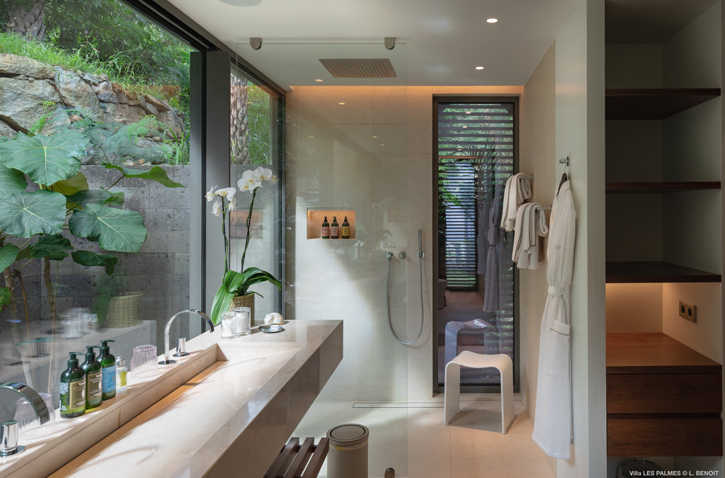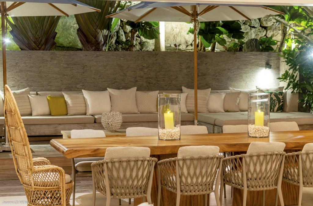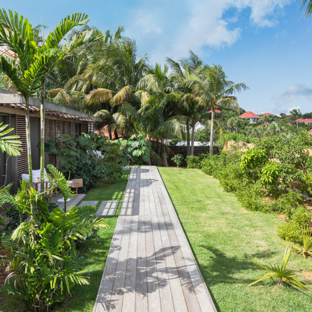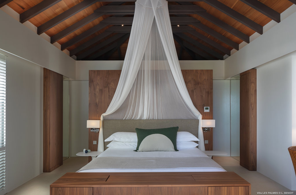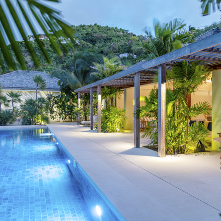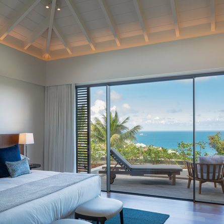 Gaze upon the picturesque village of Colombier and Flamands Bay from your perch at Villa Les Palmes, sister home Villa Les Roches just above, featuring large outdoor and indoor areas including a small garden, five bedrooms and a modern aesthetic with air conditioning throughout — great for friends and family to enjoy the St Barths life in Colombier.
