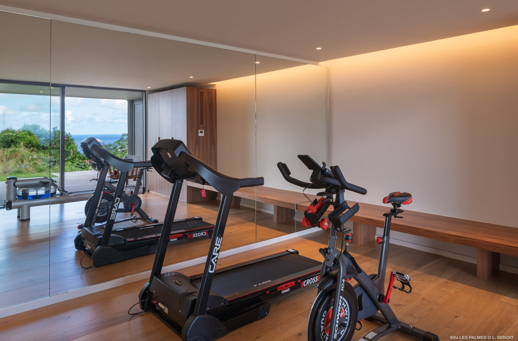 Air conditioning, TV, Treadmill, Indoor bike, Rowing machine.
