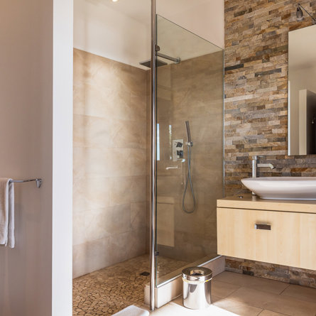 Ensuite bathroom, Walk-in shower, Sink, Hair dryer, Toilet.