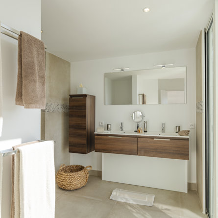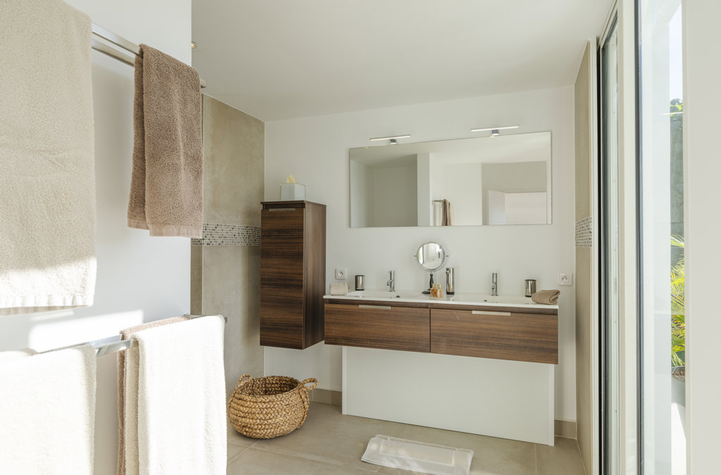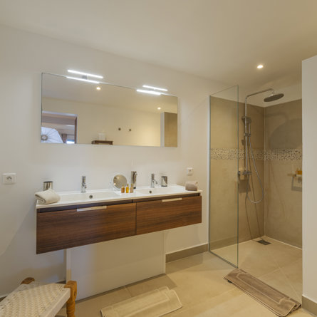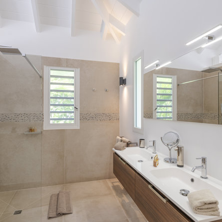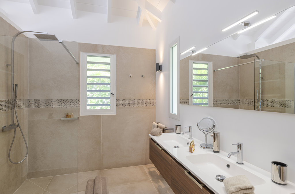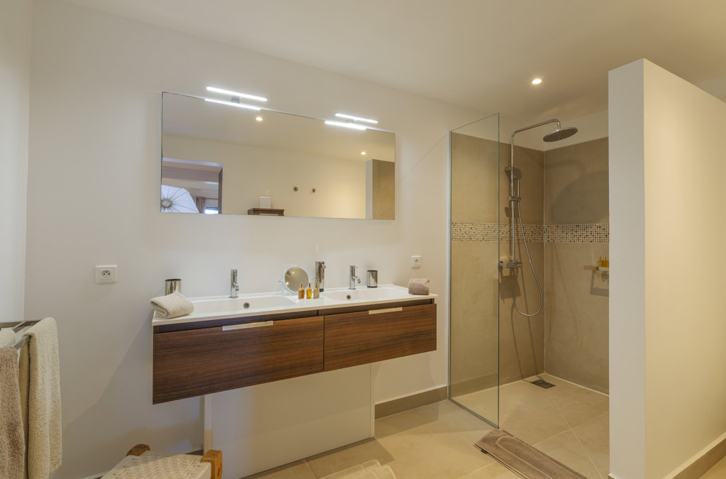 Open bathroom, Walk-in shower, Two sinks, Hair dryer, Open toilet.