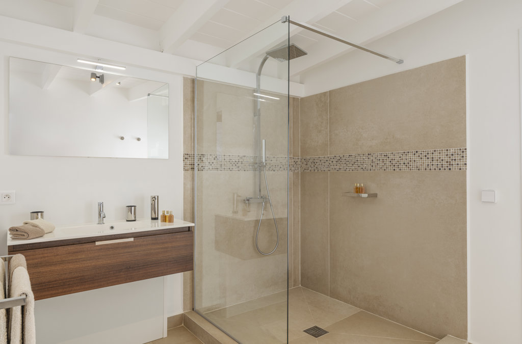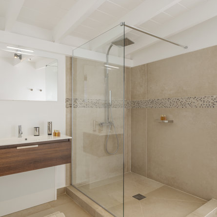 Open bathroom, Shower, Sink, Hair dryer, Separate toilet.