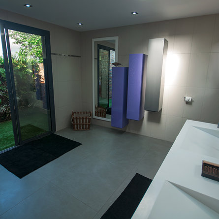 Ensuite bathroom, Walk-in shower, Two sinks, Hair dryer and Toilet.