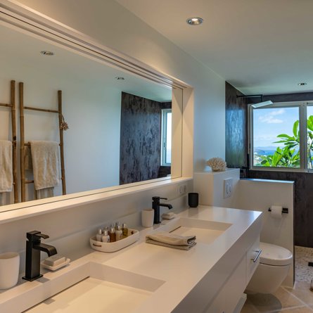 Ensuite bathroom, Walk-in shower, Two sinks, Hair dryer, Open toilet.