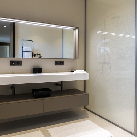Ensuite bathroom, Walk-in shower, Two sinks, Hair dryer, Open toilet.