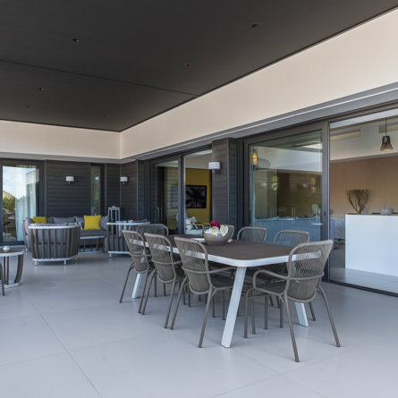 Sea view, Terrace, Dining table, Jacuzzi, Sun beds, Sofa.