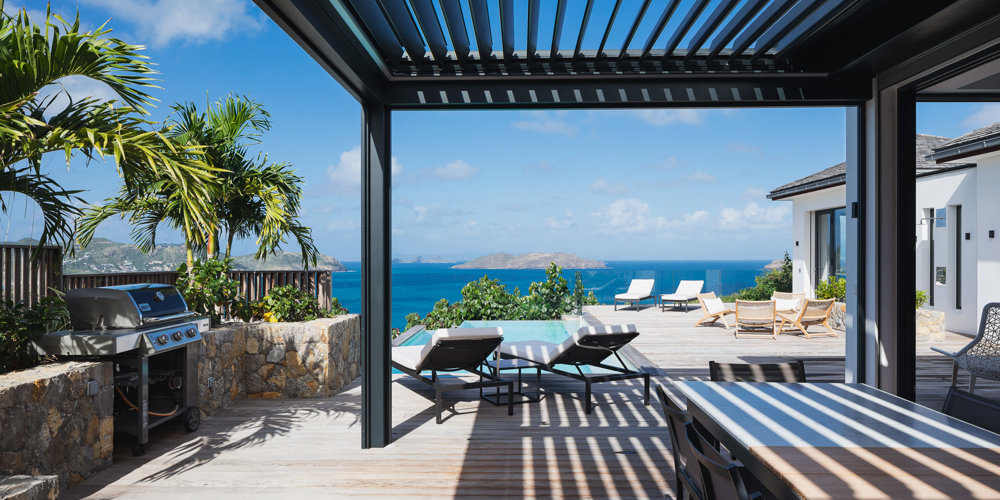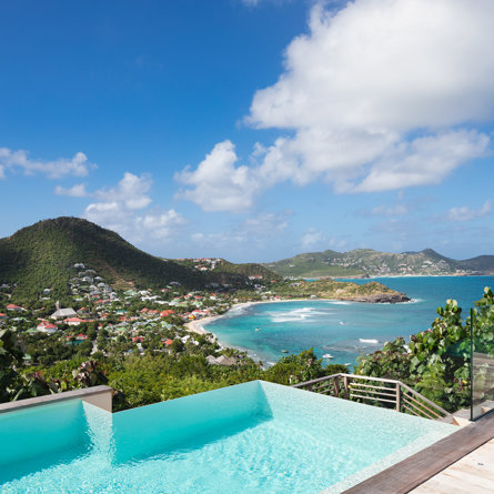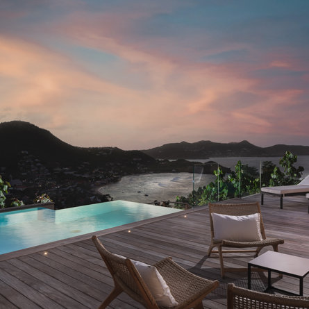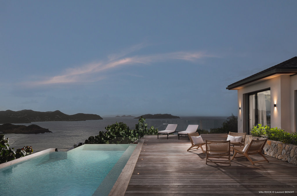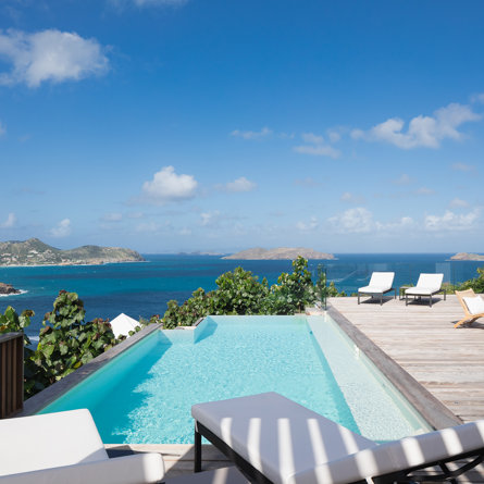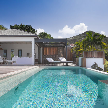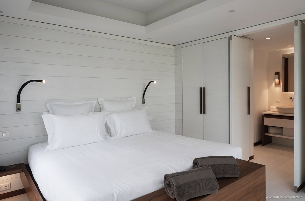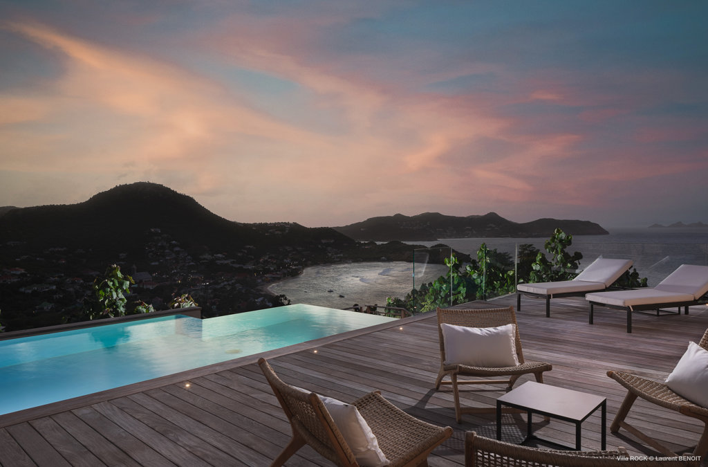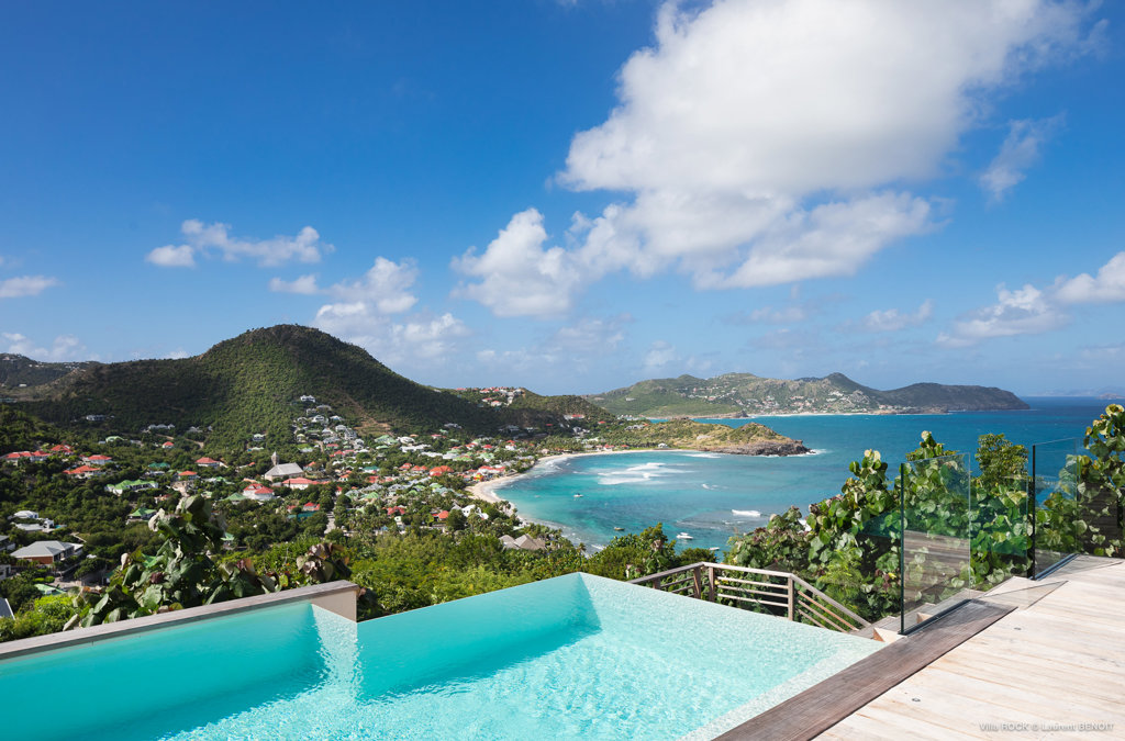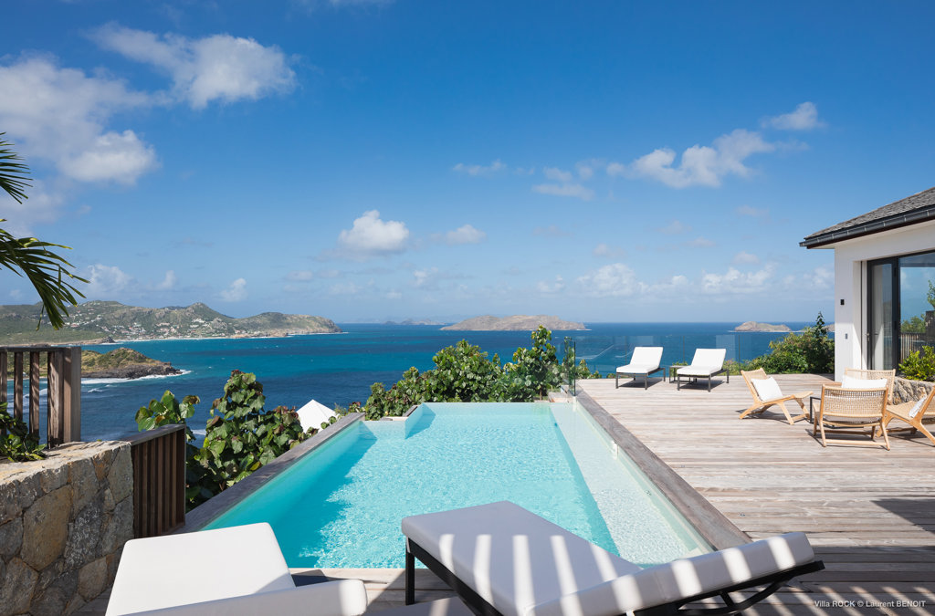 The petite Villa Rock is set high on a hill above Lorient, featuring a refined, Hamptons style décor with equal-sized bedrooms, lots of natural light and a very large pool deck overlooking the dazzling sea view.