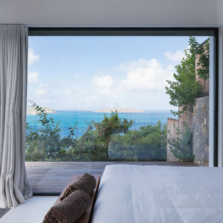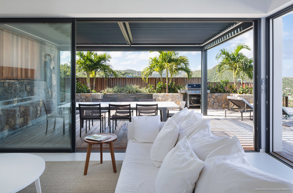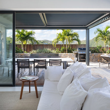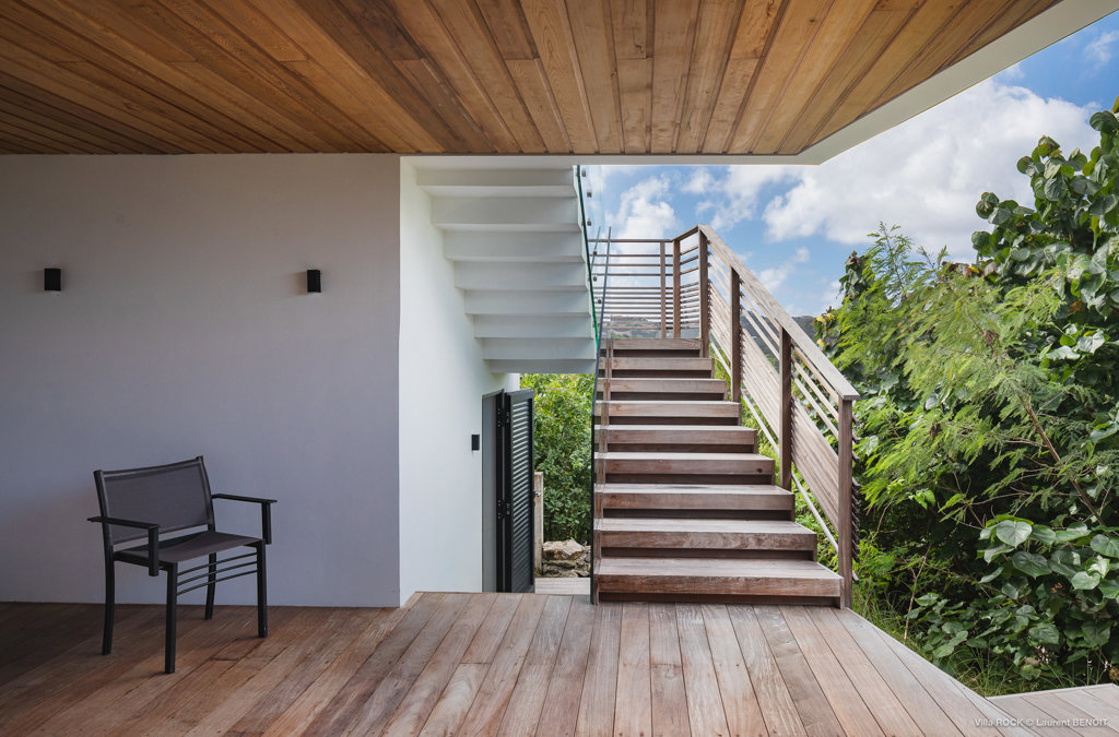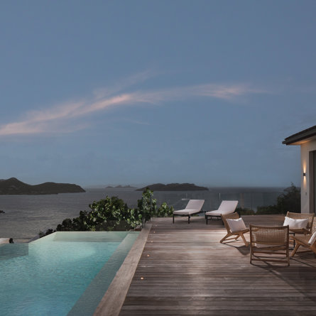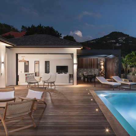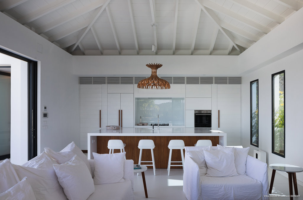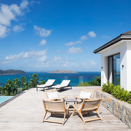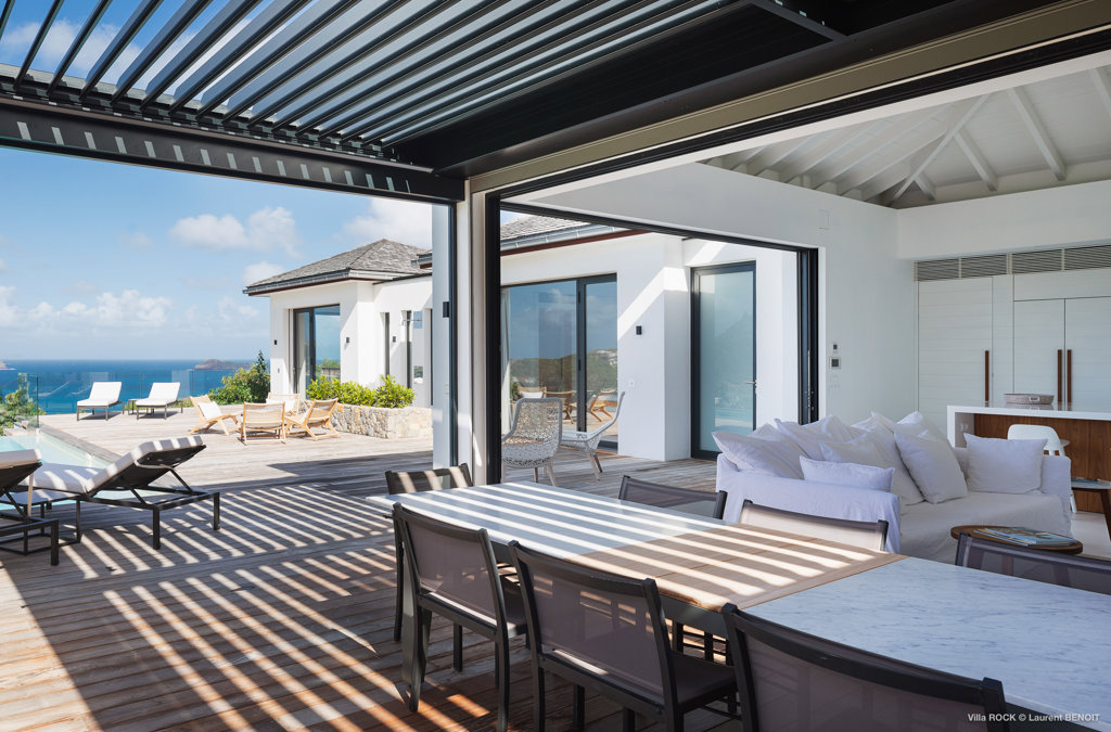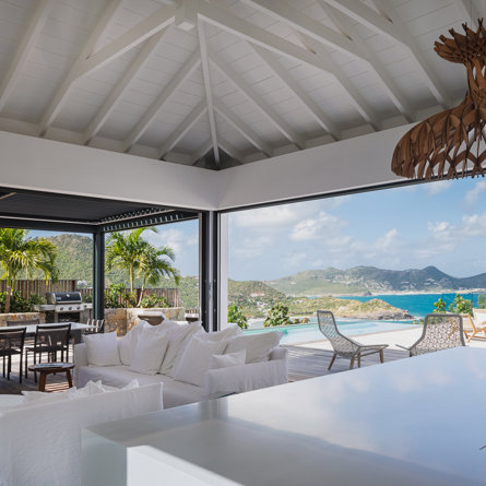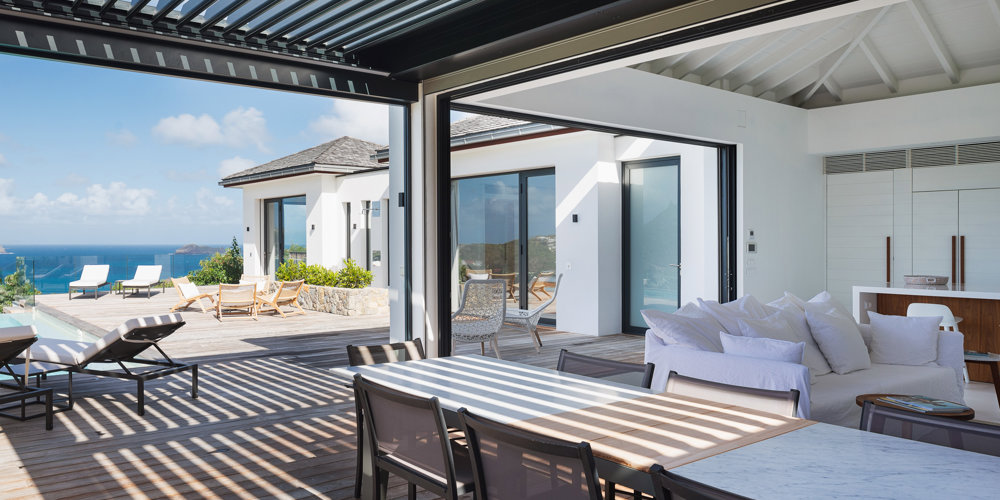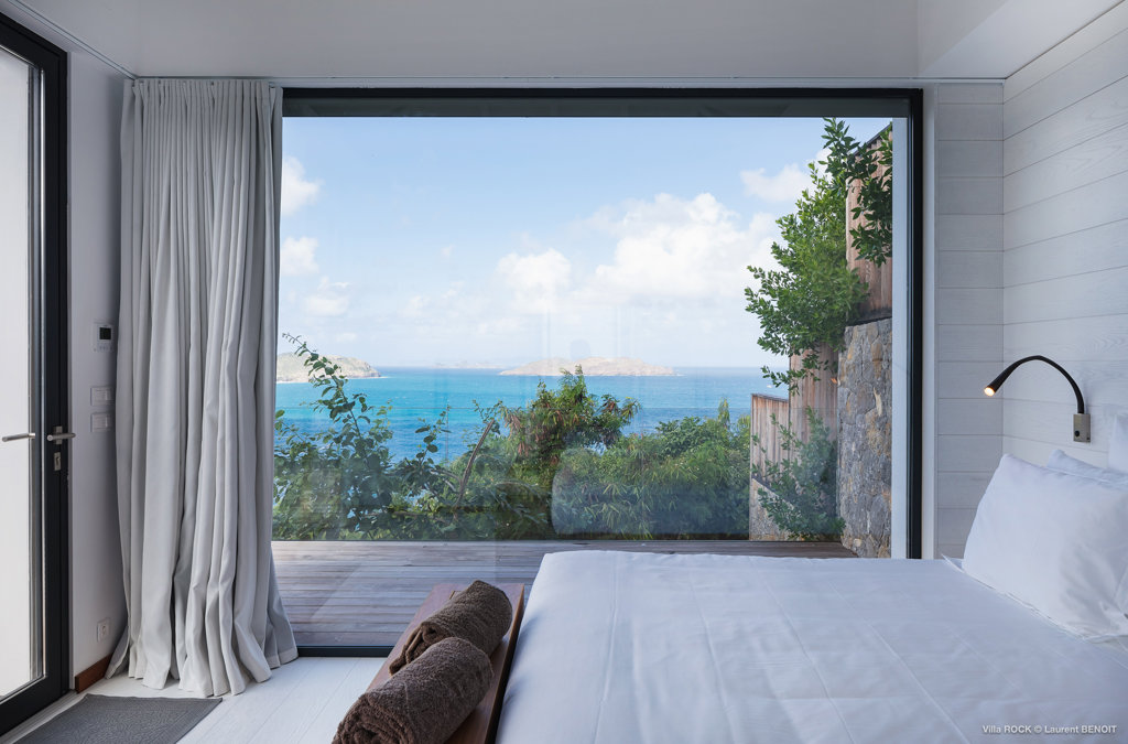 The petite Villa Rock is set high on a hill above Lorient, featuring a refined, Hamptons style décor with equal-sized bedrooms, lots of natural light and a very large pool deck overlooking the dazzling sea view.
