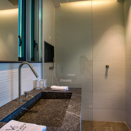 Ensuite bathroom, Walk-in shower, Sink, Hair dryer, Open toilet.