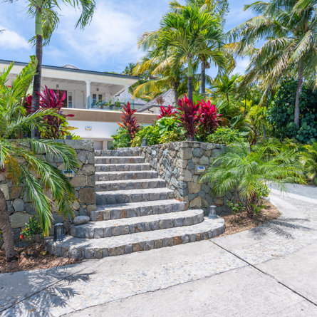 Gated entrance, 5 parking spaces, a few steps leading to the infinity pool and a few more leading to the porch and the main house